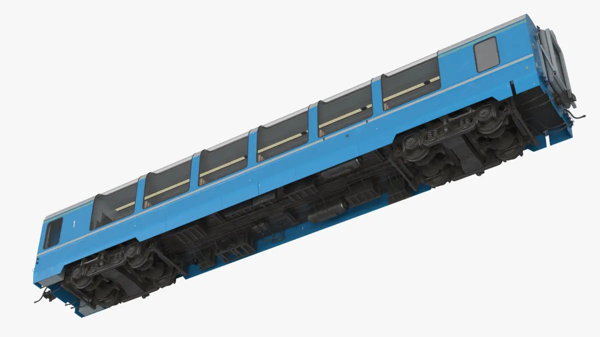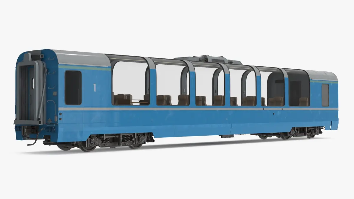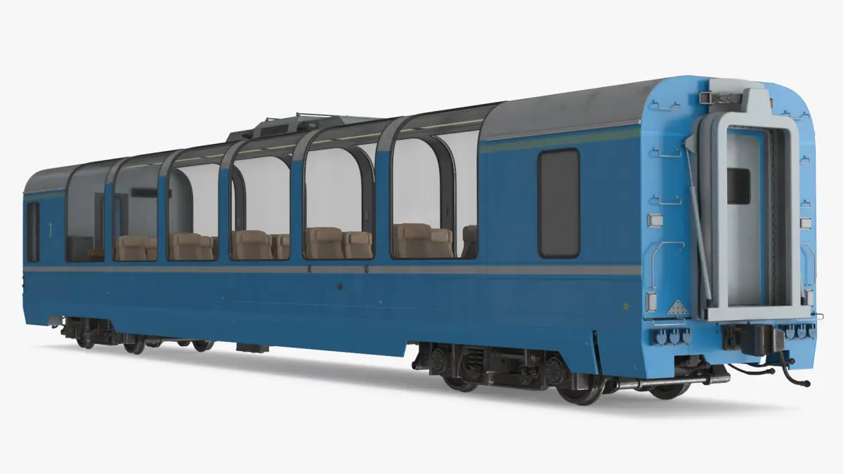 Observation-Class Train Car with Luxury Seating Blue with Interior is a three-dimensional model of luxury passenger train car, designed for scenic and comfortable railway journeys.