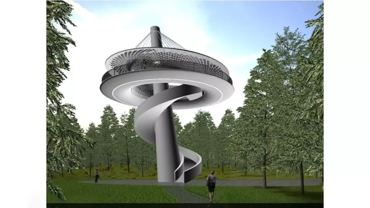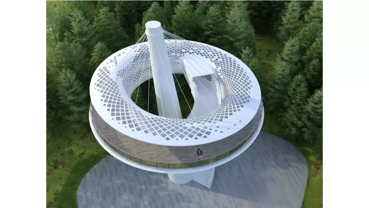 This is a highly modern observation deck building, whose main body is presented in pure white and stands tall amid the dense forest. The building adopts a unique spiral structure to connect the ground with the upper observation platform. The upper platform is linked to the central tower column by stay cables, creating a visually striking effect full of tension.The platform is equipped with a ceiling featuring an openwork design, which not only ensures an unobstructed view for sightseeing but also enhances the artistic appeal of the building. Visitors can overlook the panoramic view of the forest from the observation platform. The integration of the building with the natural landscape demonstrates unique aesthetic value, making it a typical work in modern landscape architecture that combines both functionality and artistry.