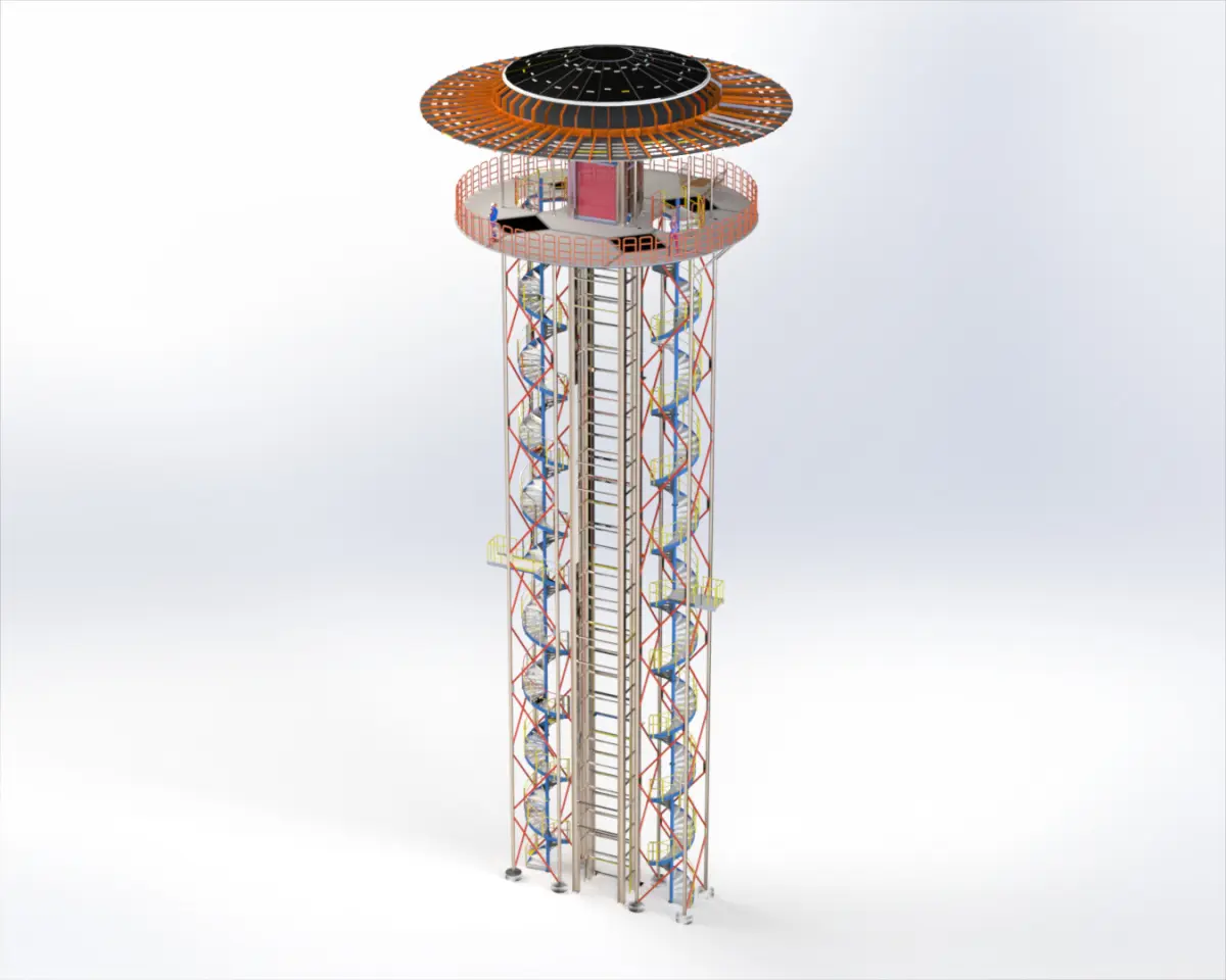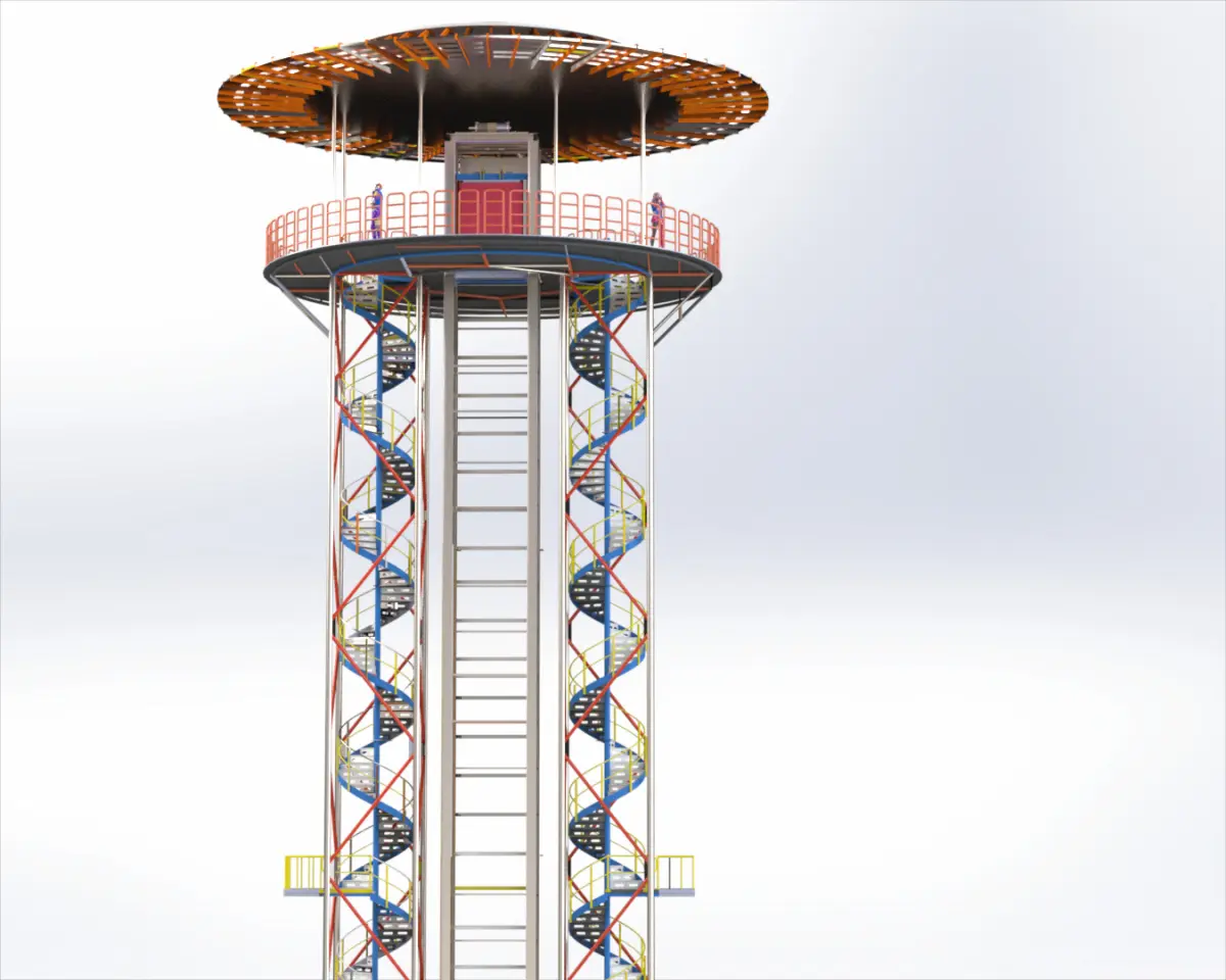 High-quality 3D model of an industrial observation tower, designed in SolidWorks 2023 with real-scale proportions. This structure features a central elevator and two symmetrical spiral access stairs leading to an elevated viewing platform with perimeter guardrails and a decorative canopy.