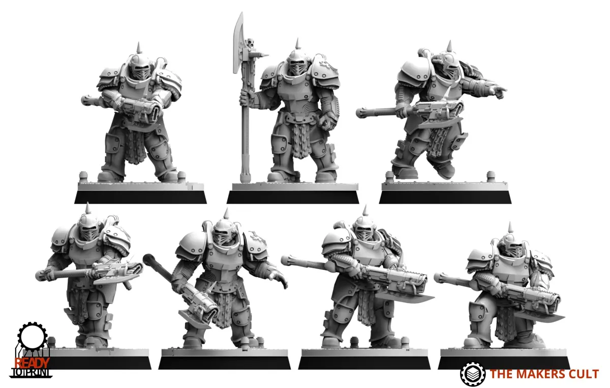 The Silahdar Squad is a fully modular 3d printable kit that comes with 10 legs, basetoppers, alternate arms, a selection of helmeted heads as well as a varitey of weapons and accessories. Parts are split into Leg, torso, arms, shoulderpads and head and are all crss compatible with both out black knights and tempest legion lines of miniatures.