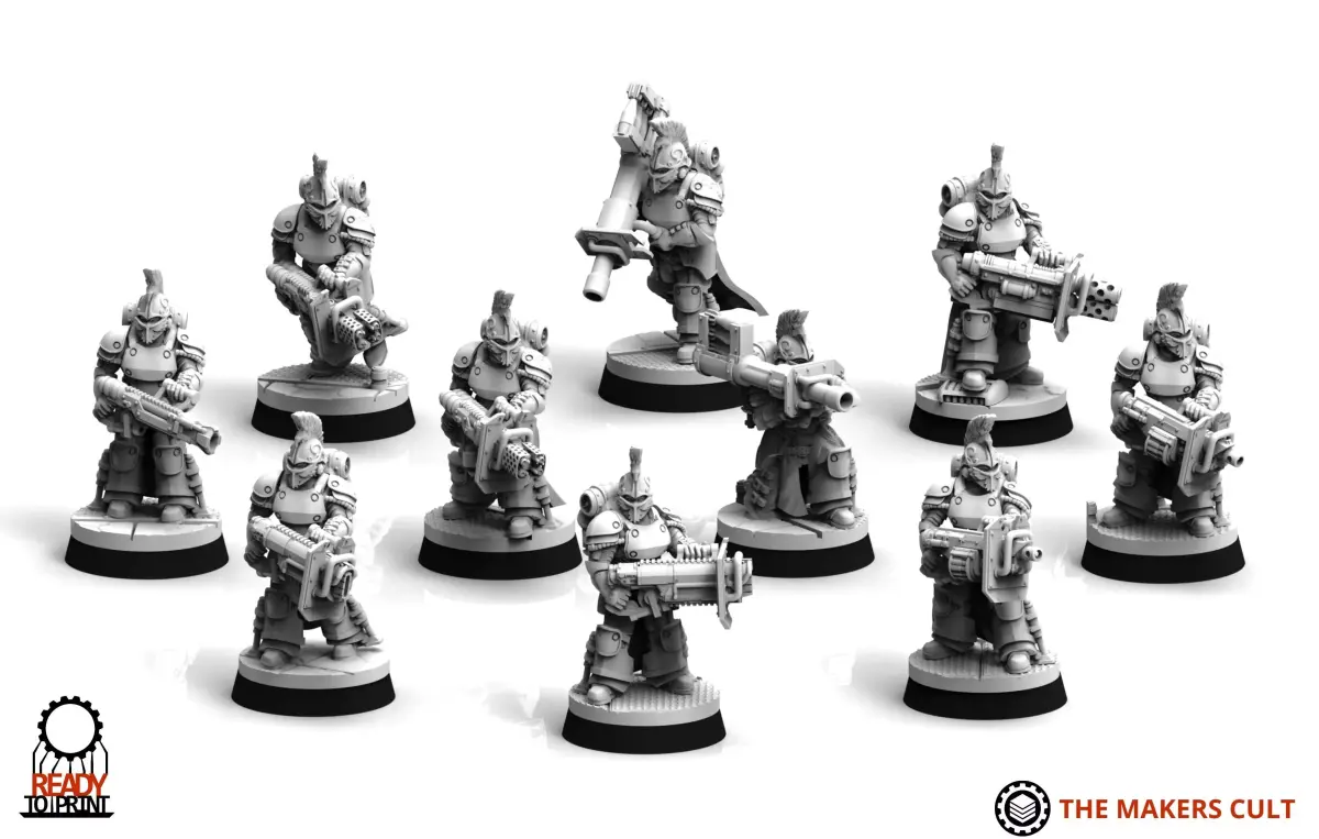 The Janissary heavy Weapons Squad is a fully modular 3d printable kit that comes with 10 legs, basetoppers, alternate arms, as well as a varitey of heavy weapons and accessories. Parts are split into Leg, torso, arms, and head and are all cross compatible with our other human scale infantry.