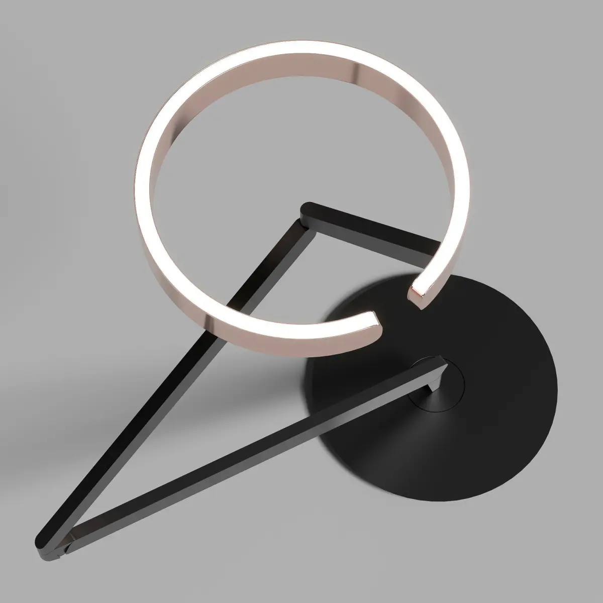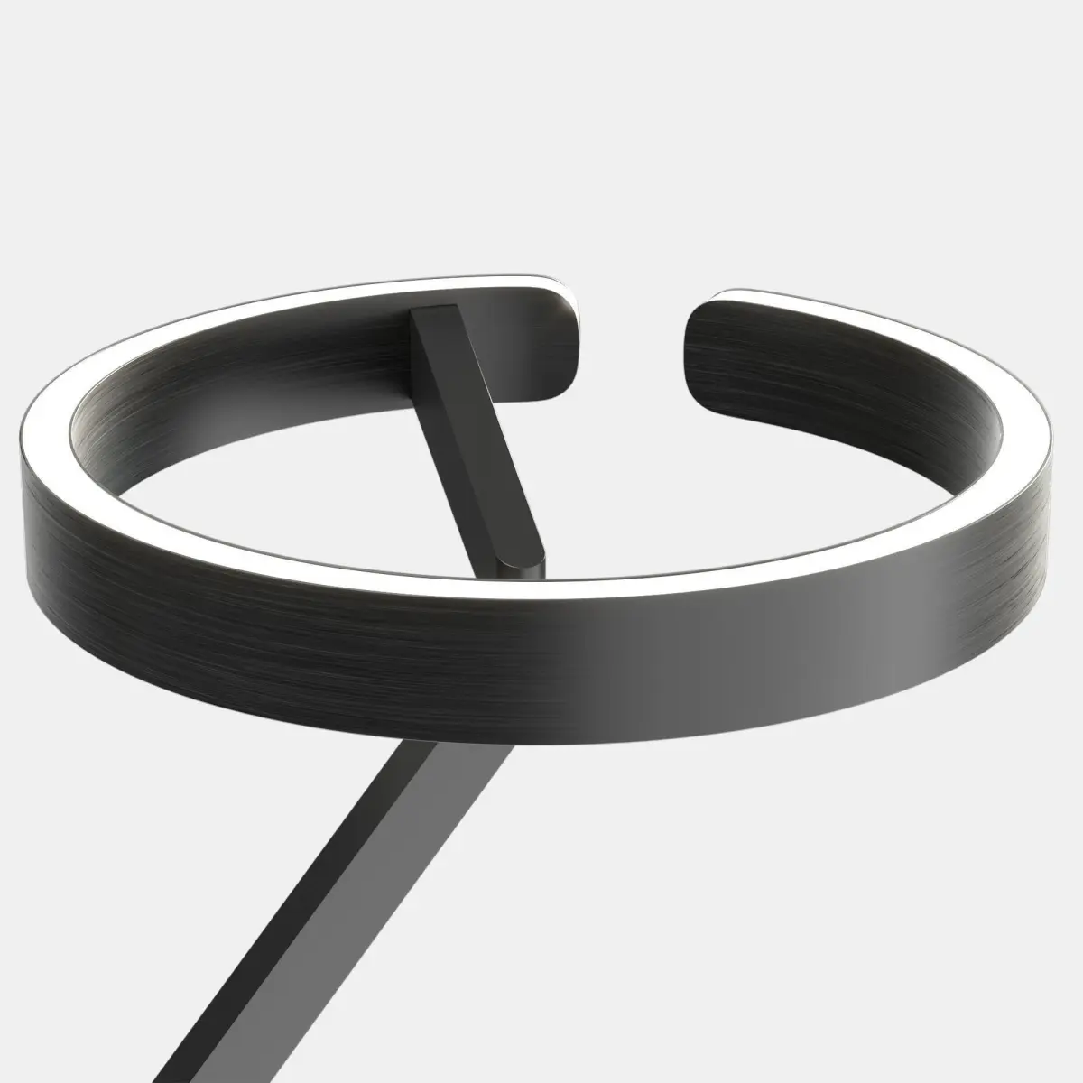 Gioia equilibrio, ring-shaped LED table lamp with light emission on both sides and a lamp head diameter of 30 cm. The head can be freely rotated through 360° without a stop. The two-part body is freely height-adjustable and also freely rotatable by 360° without a stop.