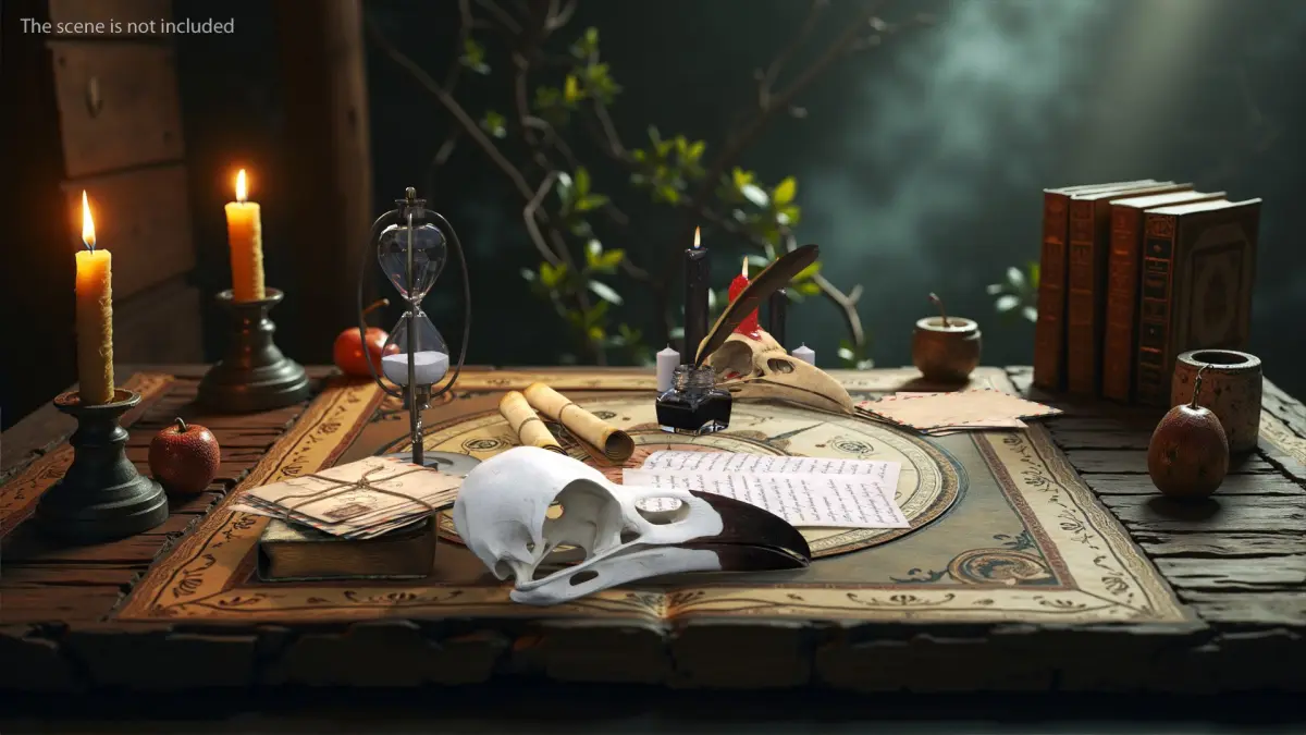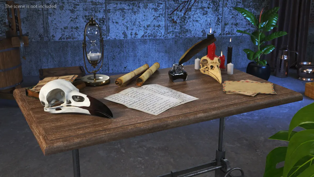 Occultists Writing Desk is a three-dimensional model of enchanting collection featuring magical and mystical items, perfect for a fantasy setting or game environment.