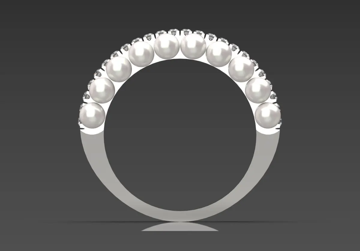 The band is smooth and comfortably fitted, with a slightly raised profile to highlight the pearls and alternating stones.