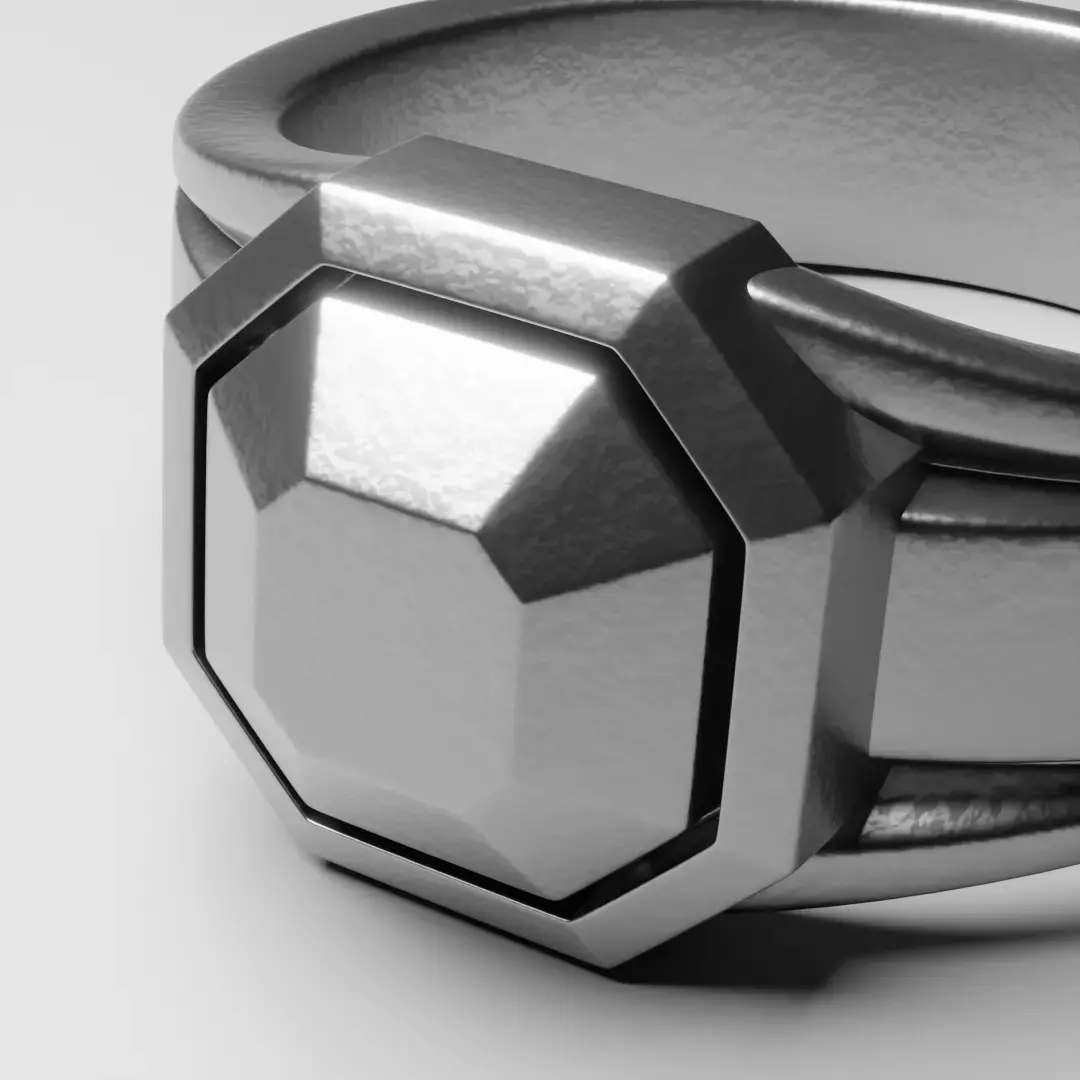- Design Style: Modern geometric signet ring with octagonal form