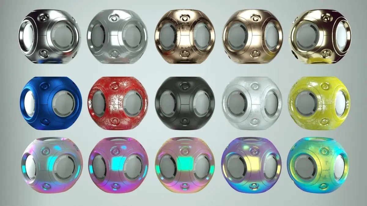 Pack of 15 Octane realistic materials, steel, aluminum, gold, bronce, worn metal, car paint, matte paint, iridescent,etc. Cinema 4d project.Pack de 15 materiales realistas de Octane Render, acero, aluminio, oro, bronce, metal desgastado, pintura de automovil, pintura mate, tornasol, etc. Proyecto de Cinema 4d.