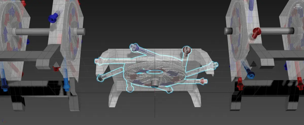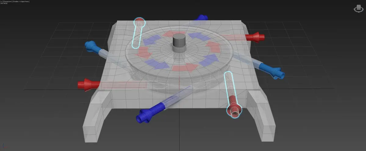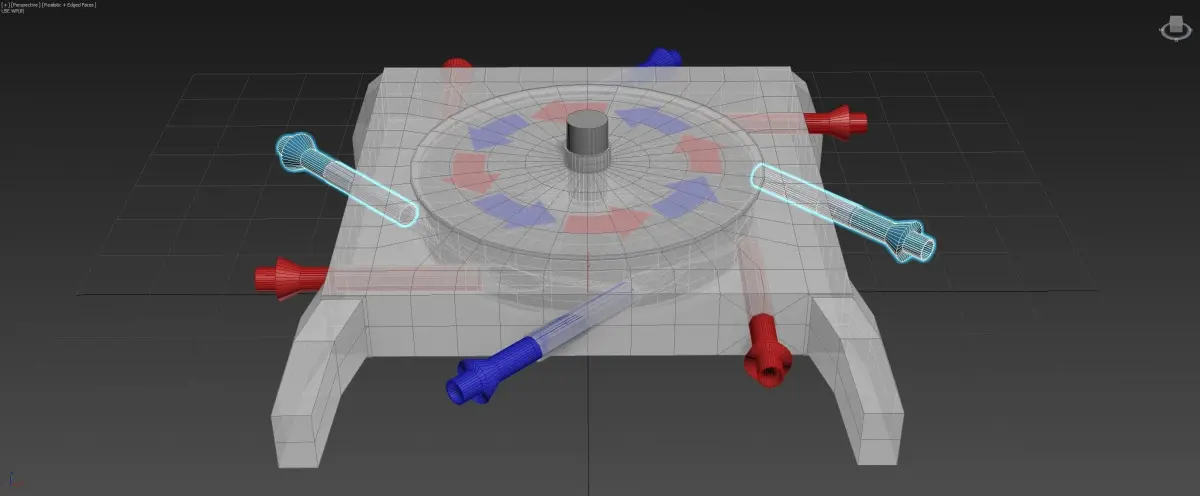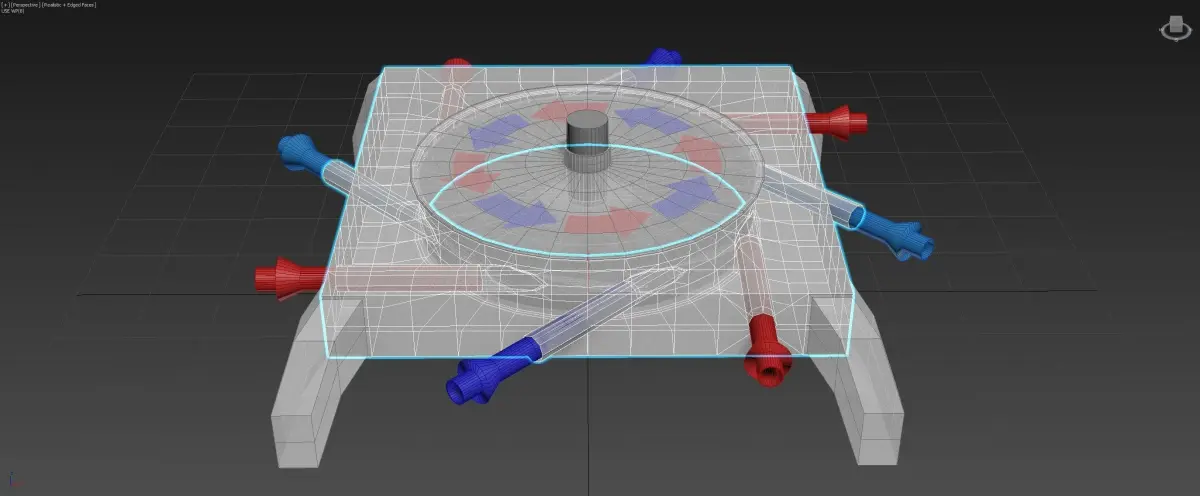 Why not instead of putting pressure and forces on a single part of the spinning discs, put equal pressure and force on them omni directionally? forces balanced on all sides. i have added small vortex nozzles inside the feeding pipes, to force water through, entering the system with a twist or a vortex, spinning onto the sides of the discs. the concept can be repeated in rows as they would then also balance the force on the center axis need to turn in order to perform work. using two or more in a row can put a lot of power onto a single axis.