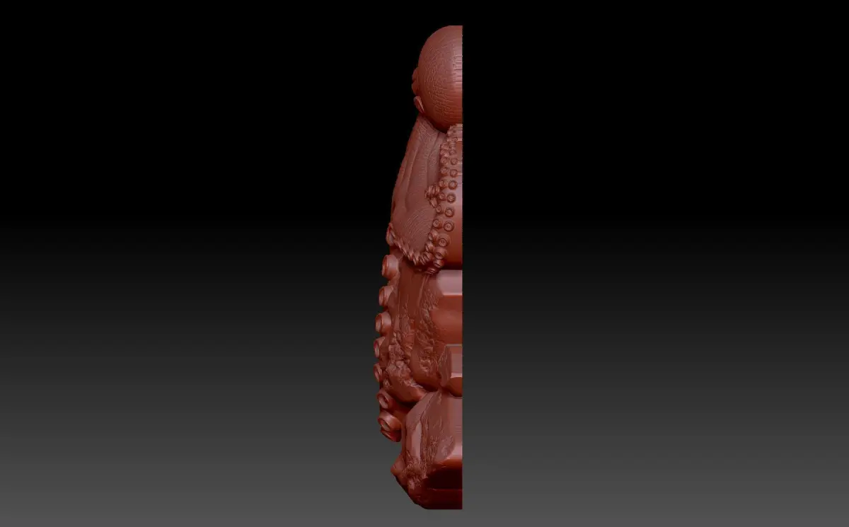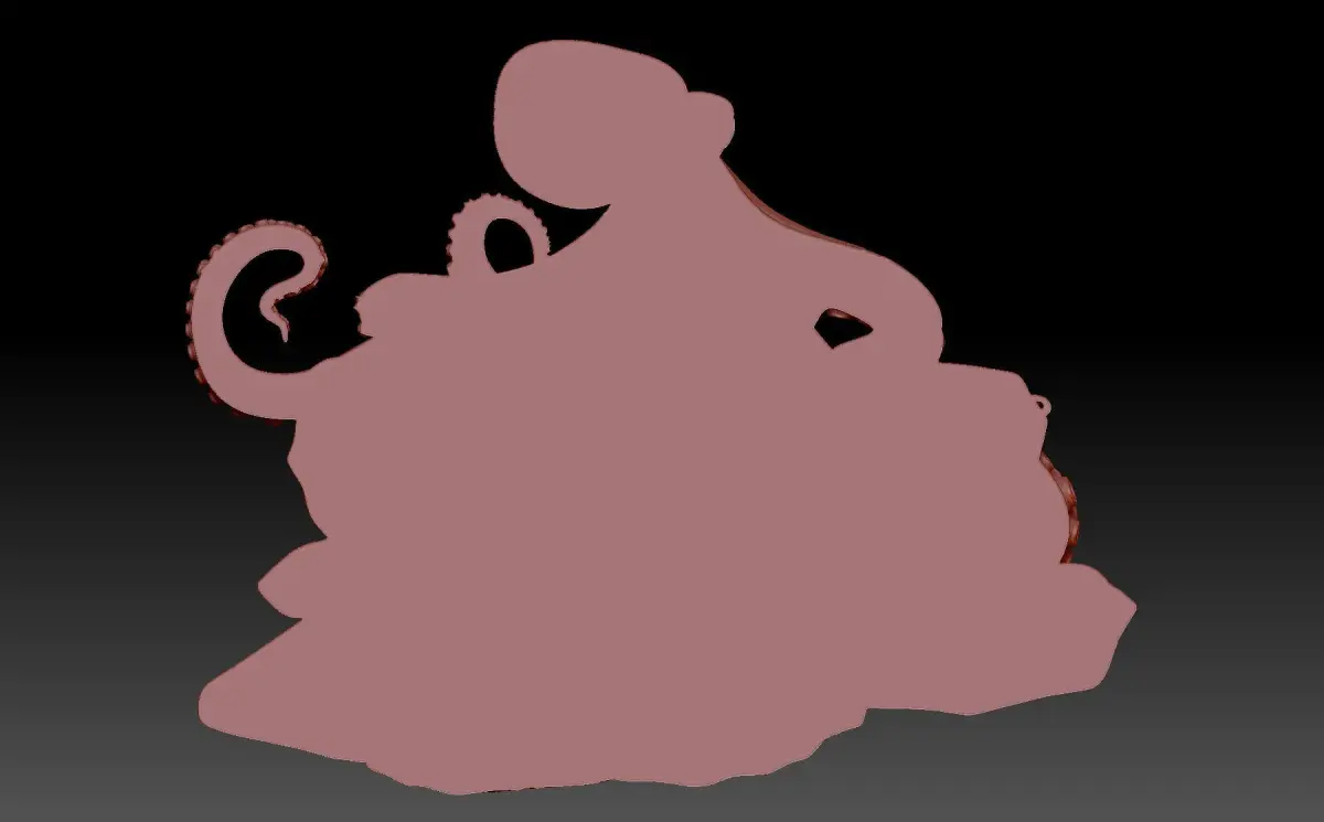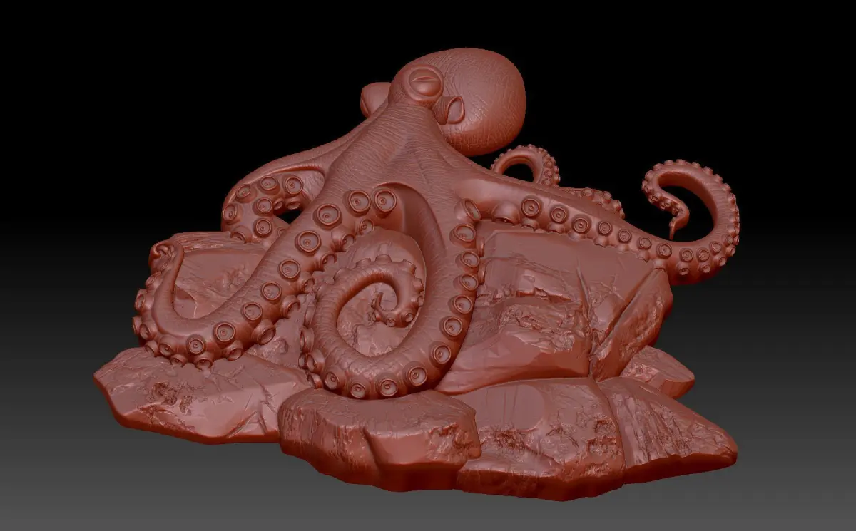 A 3D model of a bas-relief depicting an octopus. A decorative panel on a marine theme, an octopus sits on the rocks. The work is suitable for 3D printing and CNC machine tools.