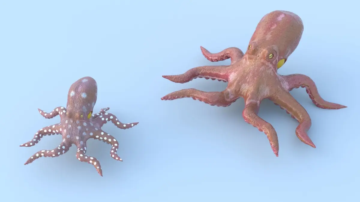 This octopus is made in ZBrush with highly reduced polygons, useful for rigging and animation. Included the scene made in Blender as shown in the picture and a high polygon model as well made in Zbrush. The texture is hand-crafted in Substance Painter. Unwrapping is also done by hand.Comes with 2 versions of texture