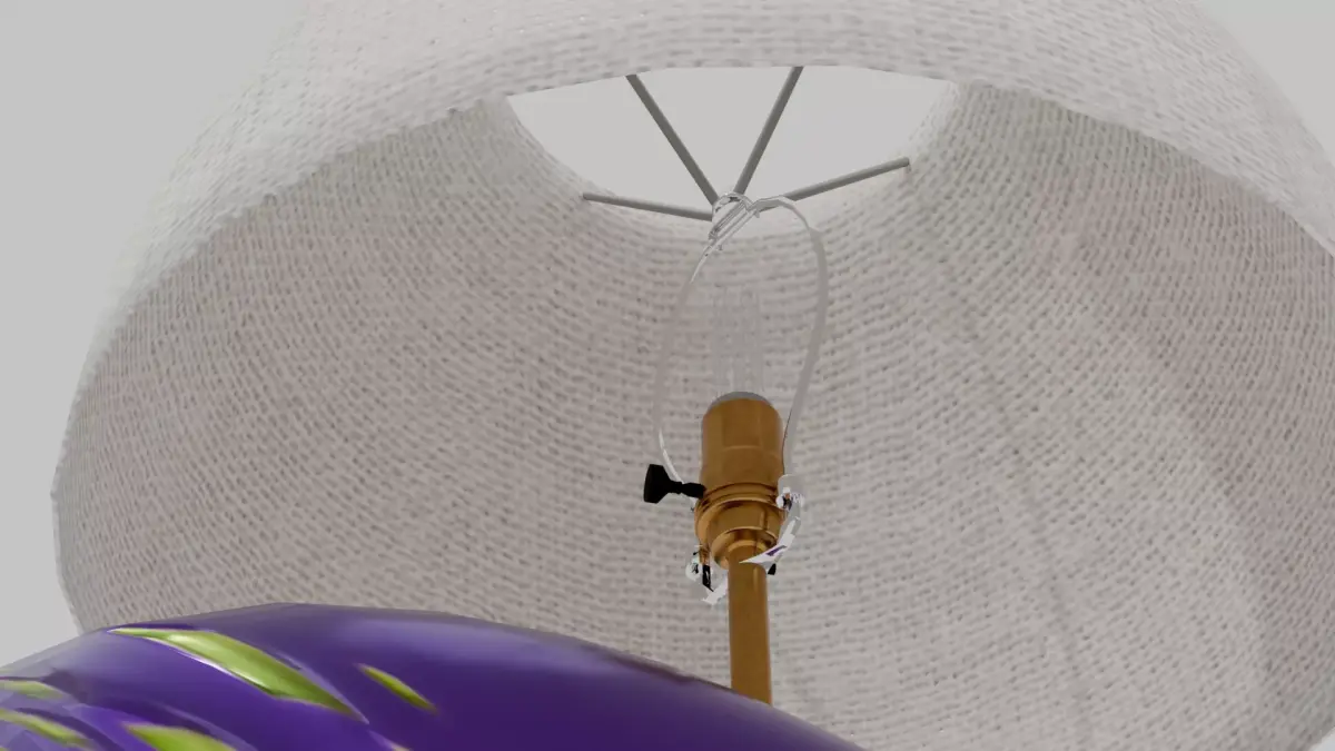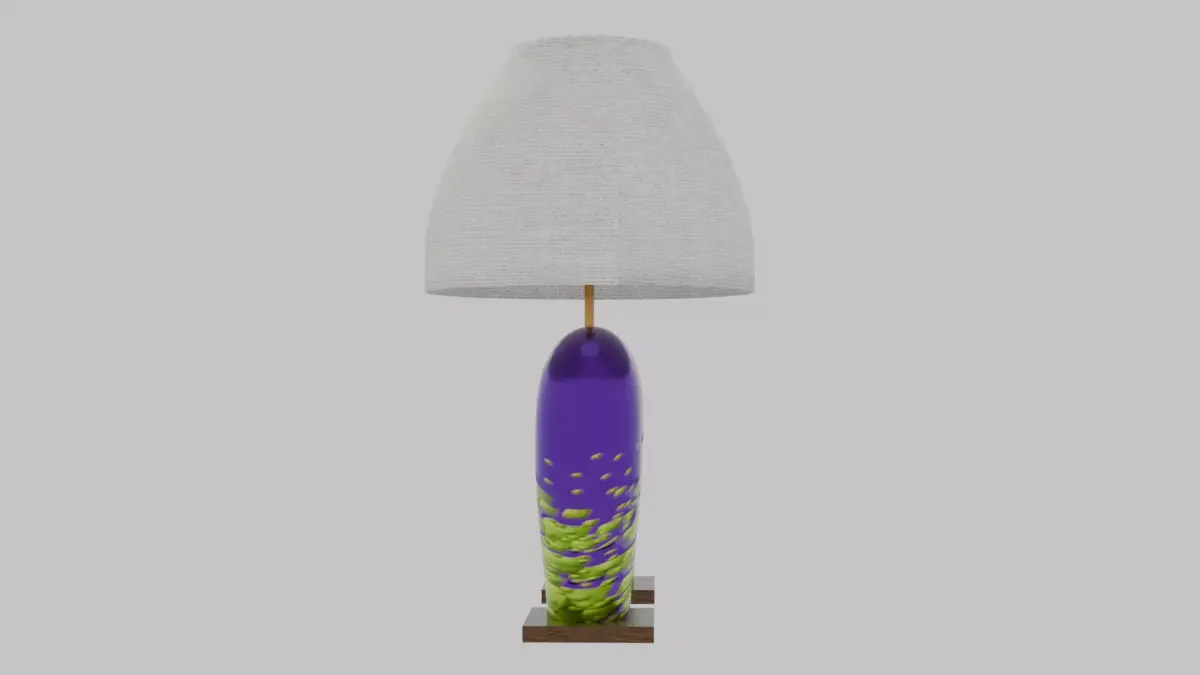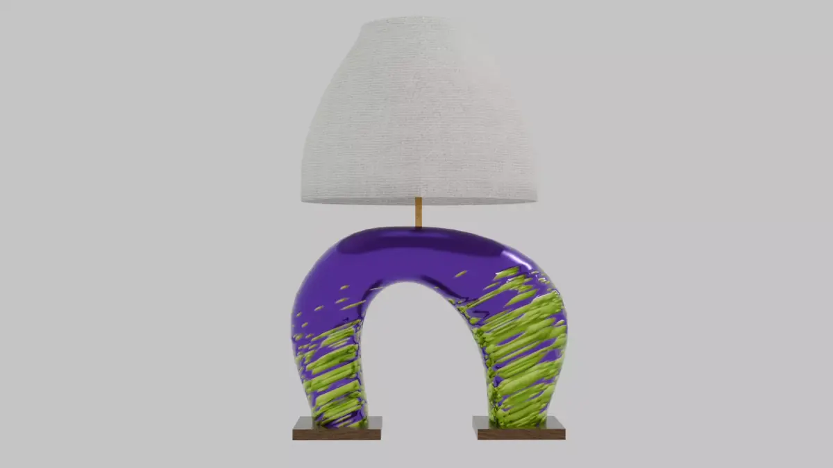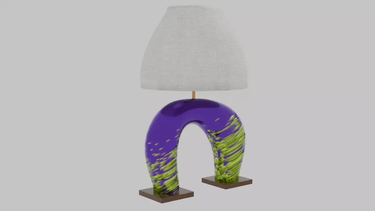 Bring sculptural interest to your 3D interiors with this Odd Organic Abstract Table Lamp. The base is formed from a torus shaped into a broad U, then asymmetrically deformed to create an irregular, organic silhouette. Finished in a glossy purple ceramic with raised green lava-glaze accents, the piece rests on two dark brown marble feet for added visual weight and stability. Above the base sits a fully detailed lamp assembly, complete with an accurate switch, chrome bale, and a neutral canvas shade.