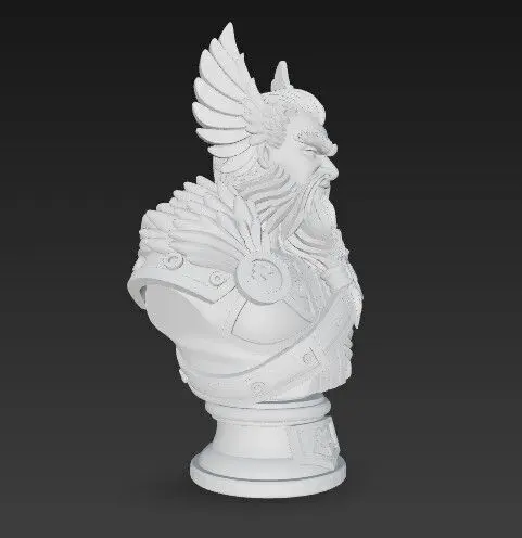 The model highlights Odin’s sacrificial wisdom through the depiction of his missing eye, while his flowing hair and beard represent age and sagacity. The stylized winged helmet connects him with the sky and war, and the armored chest and shoulder pads show his readiness for battle. The base of the bust features runic inscriptions, Nordic patterns, and symbolic mythological carvings to complete the divine aura.