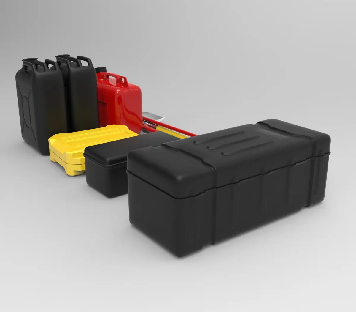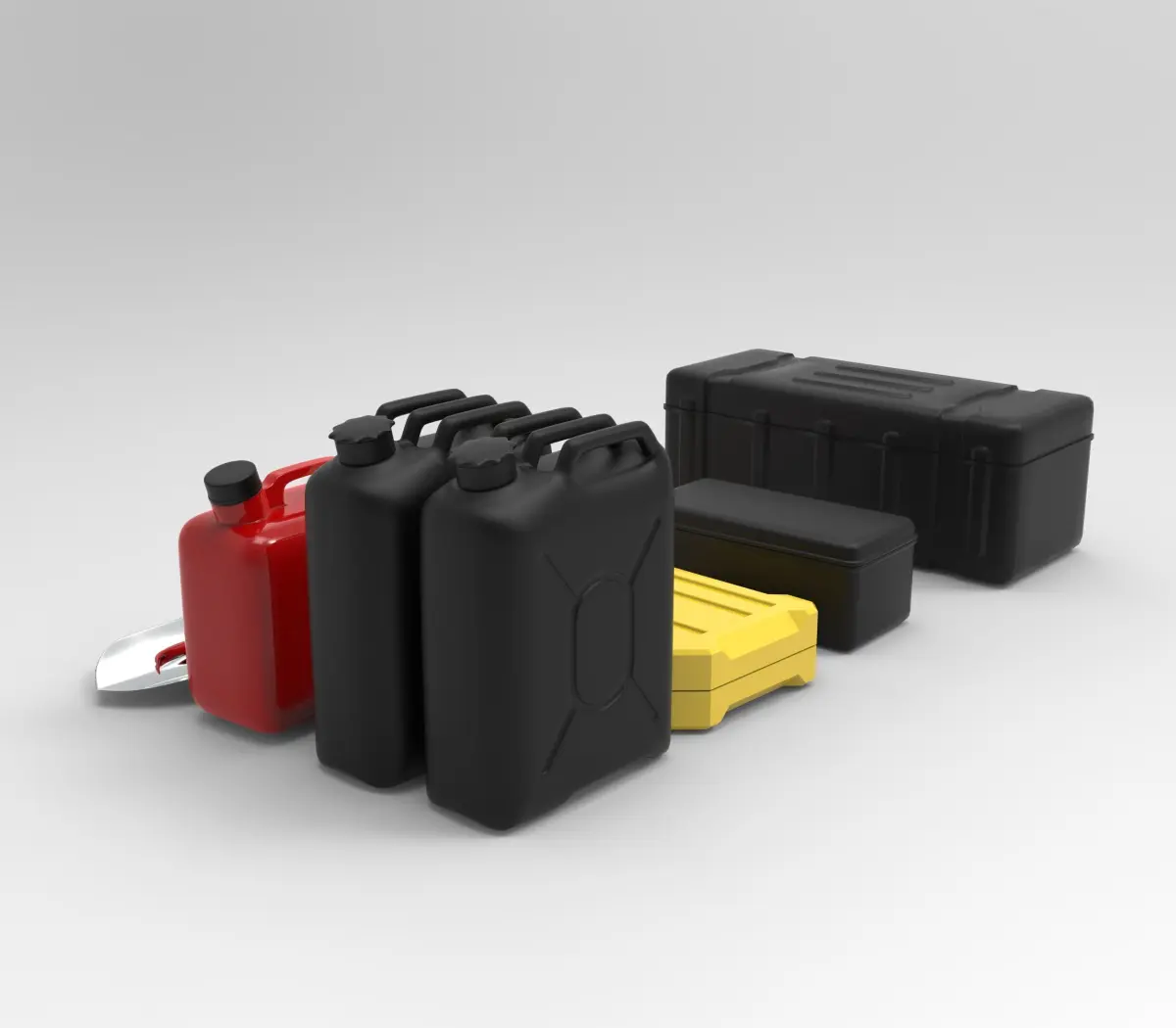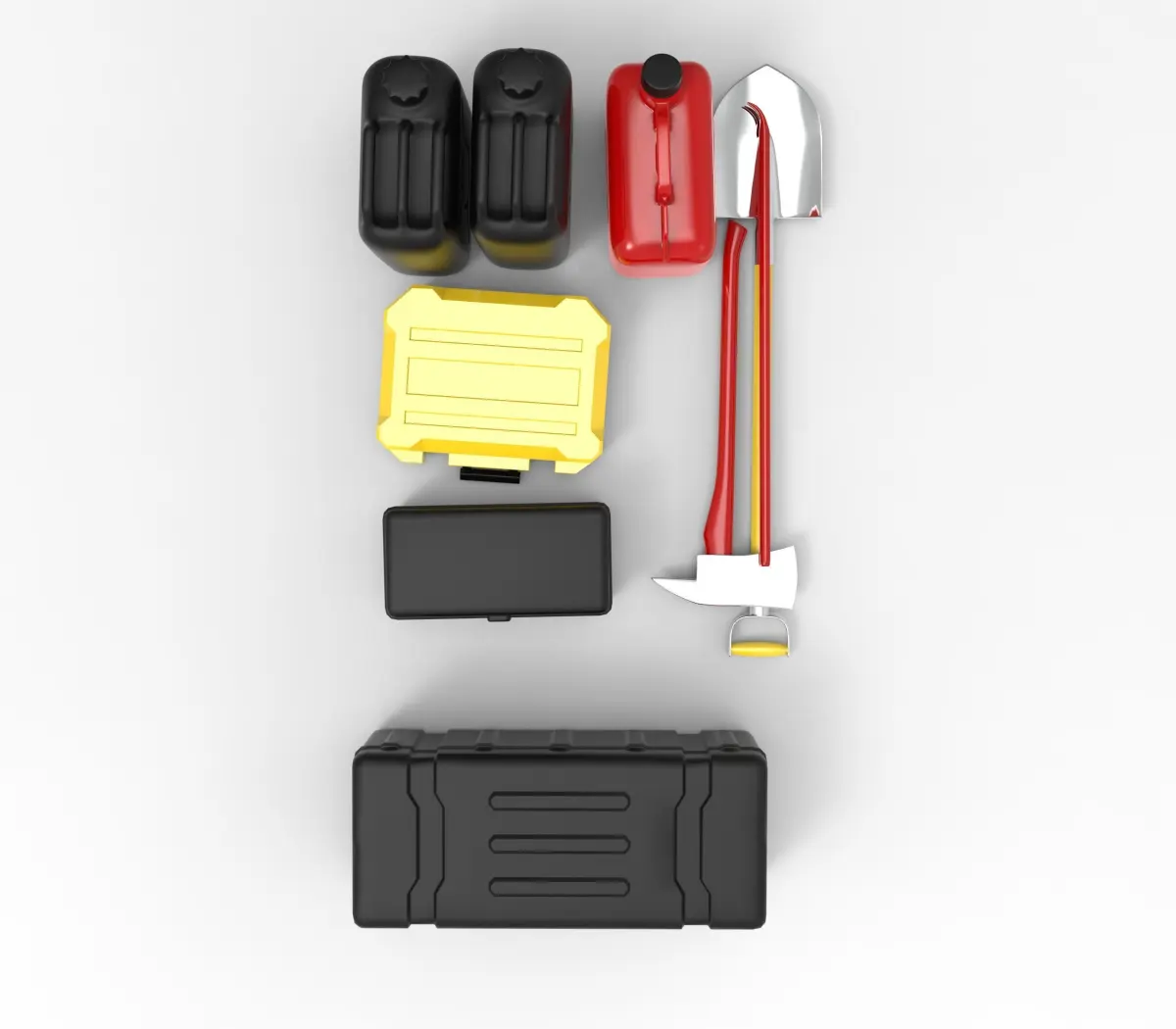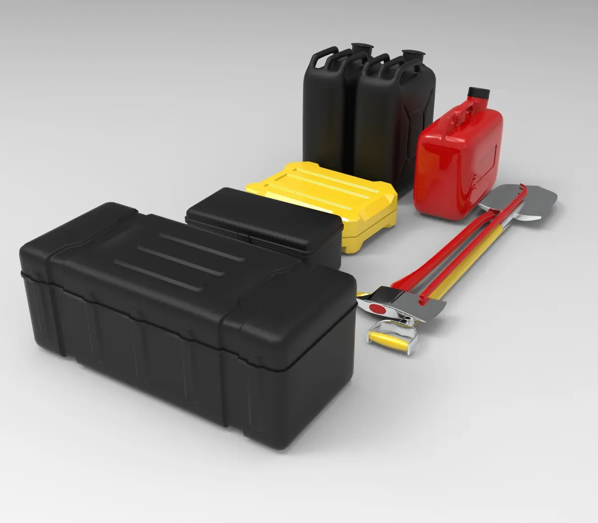 High-quality 3D model set of essential off-road accessories, including a shovel, axe, fuel jerry cans, and storage boxes. Designed for overlanding and adventure vehicles, these accessories feature realistic details, rugged construction, and optimized geometry for maximum performance. Perfect for high-quality renders, animations, VR/AR applications, and automotive visualizations, this set is ideal for projects focused on off-road modifications, survival gear, or expedition vehicle setups.