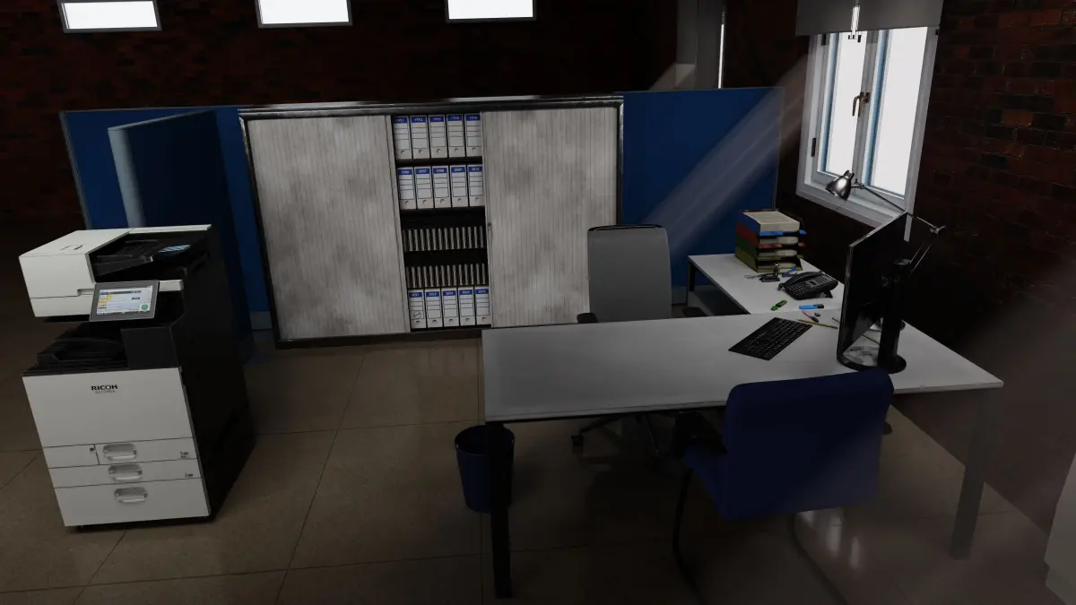 3D scale model that represents a fully furnished office, including: architectural elements (floor, ceiling, partition walls, roof frame, ceiling lamps), furniture (table, chairs, cupboard, photocopier, air conditioning, lamps, blinds); and desk objects (telephone, computer screen, keyboard, folders, pens, pencils, scissors, sharper, staple).