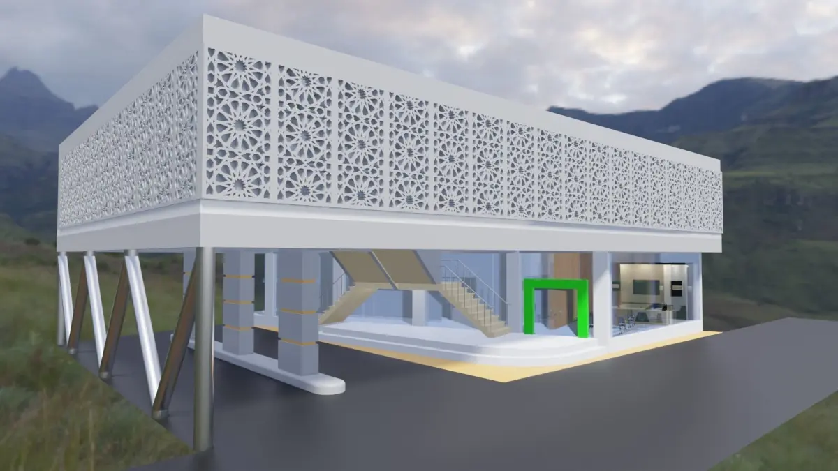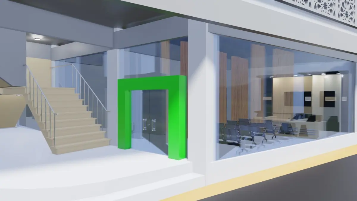 little mosque in office with 2 floors. it's building with 2 way of road beside of office. modern design build up on the road.this make your idea for new build from your idea.