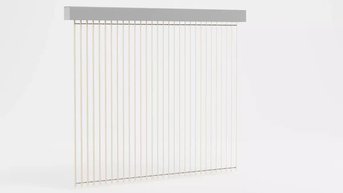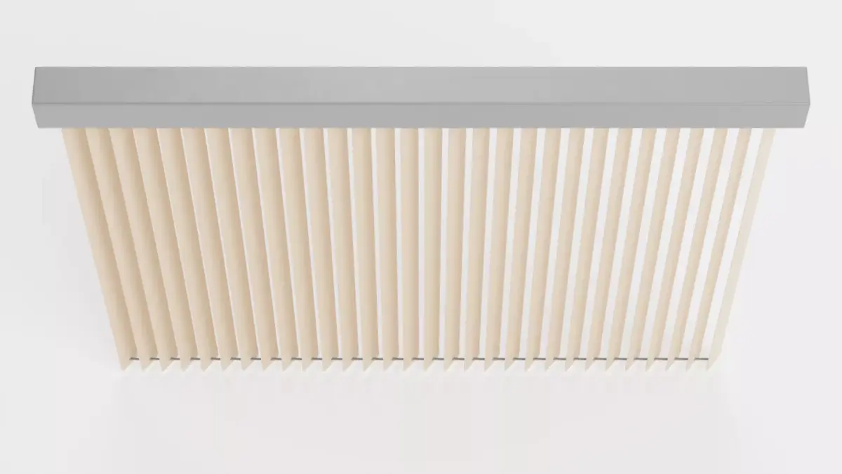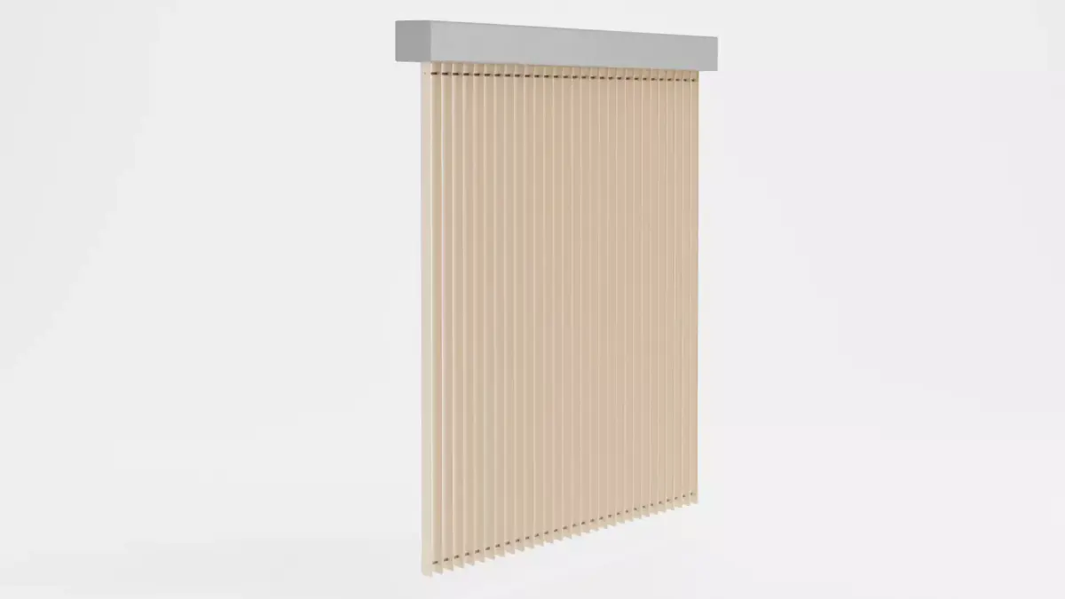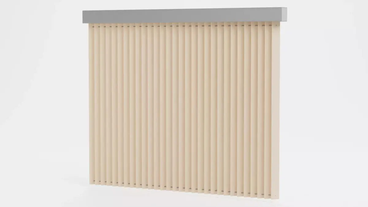 A realistic set of vertical window blinds designed for office interiors and architectural visualization. The model features a rail system with vertically hanging fabric slats arranged in a closed position, providing complete window coverage and privacy. Neutral beige textile panels give the blinds a modern, understated look that fits naturally into offices, meeting rooms, clinics, and other workplace environments. With their clean structure and universal style, the blinds work well as a practical interior detail for modern visualization scenes.