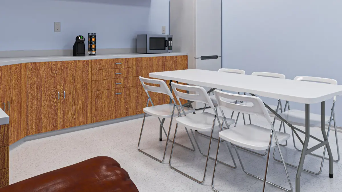 Office Break Room Interior is a three-dimensional model of a modern breakroom, designed to provide a relaxing and functional space for employees in an office environment.