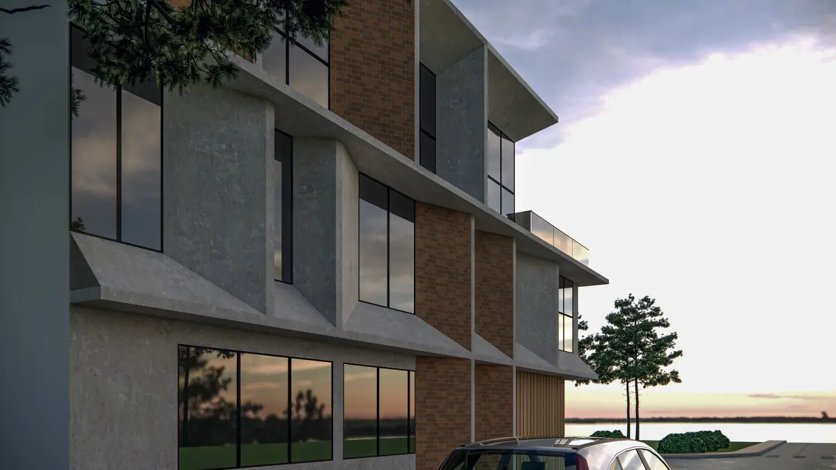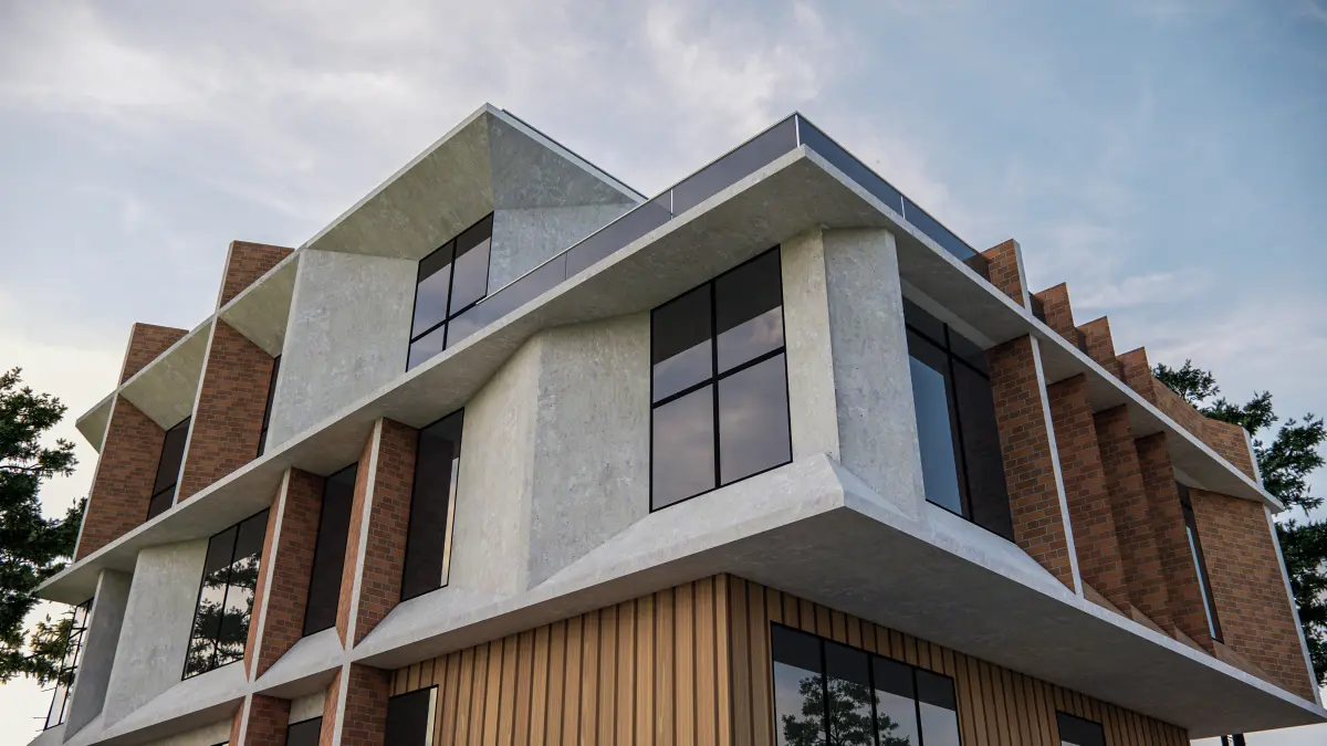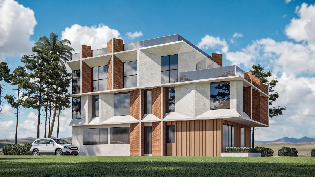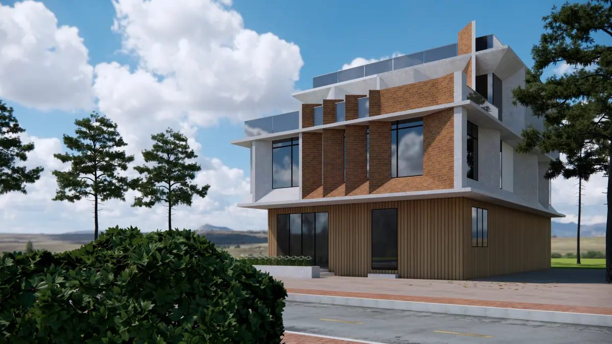 - Elegant Material Palette: A clean blend of vertical wood paneling, concrete textures, and aluminum framing enhances realism and architectural appeal.