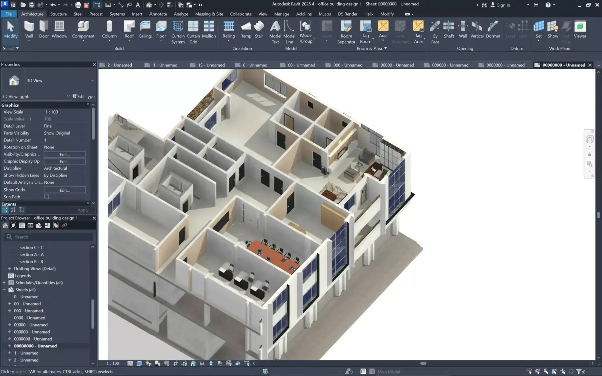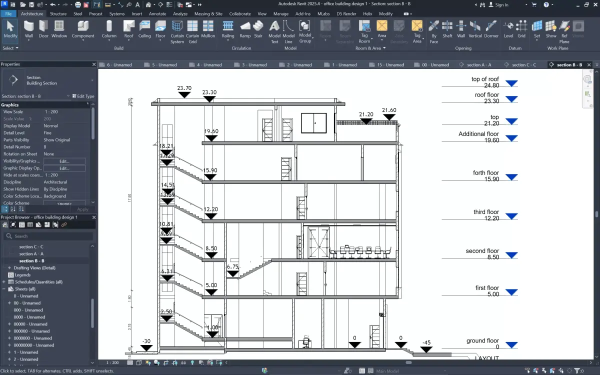This package includes a complete architectural design for a 5-floor modern office building, delivered as a fully organized and professional bundle.The project features a ground floor with flexible commercial spaces and four upper office levels designed with efficient layouts and premium façades.All drawings, 3D files, and visuals are clean, well-structured, and ready for use in presentations, development, or further design work.