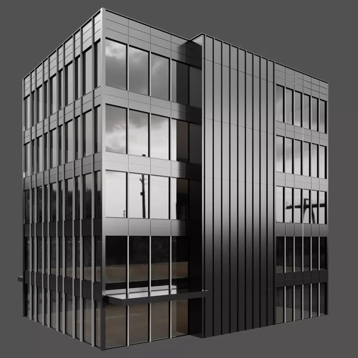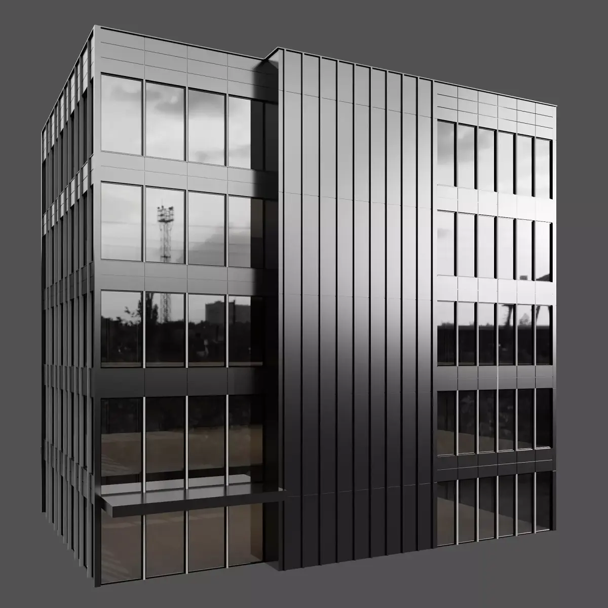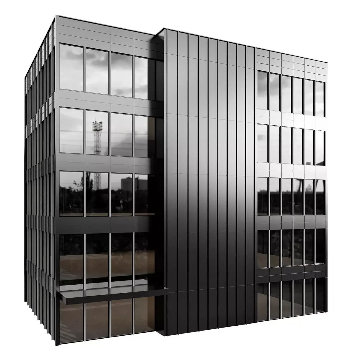 modern office building with a contemporary design, featuring black aluminum cladding and large reflective glass windows. This detailed and optimized model is perfect for architectural visualization, real estate presentations, cityscape rendering, and commercial design projects. Ideal for creating realistic exterior renders of business towers, office complexes, and urban commercial buildingsPerfect for showcasing corporate headquarters, business centers, or modern commercial blocks in exterior renders