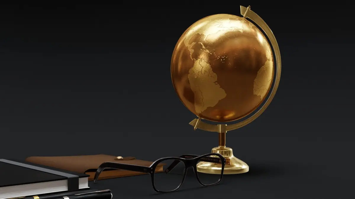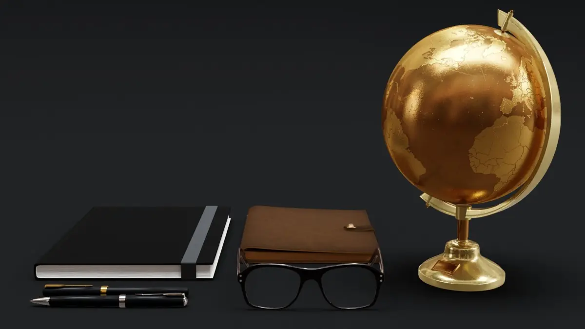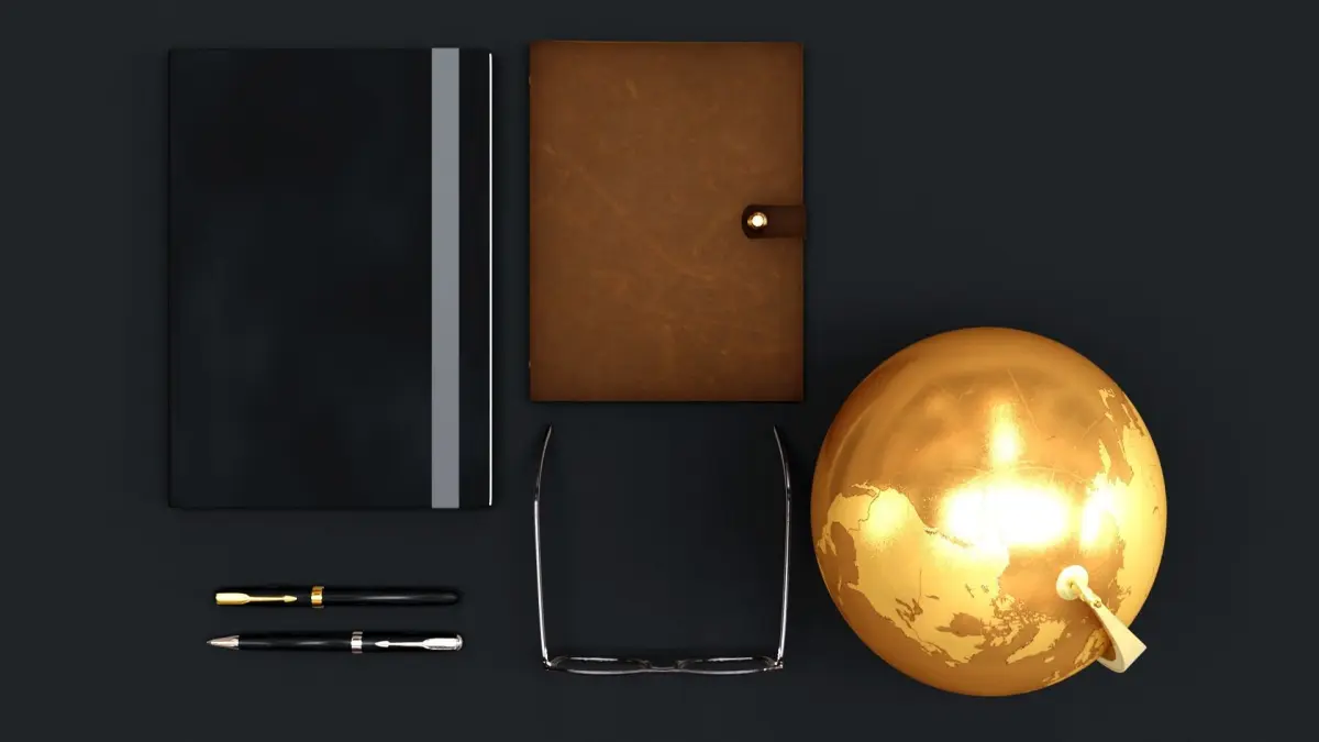 THIS MODEL CONTAINS:1 Black Copybook1 Leather Agenda1 Black and Silver pen1 Black and gold pen1 Pair of glasses with black frame and golden ornaments1 Golden world globe