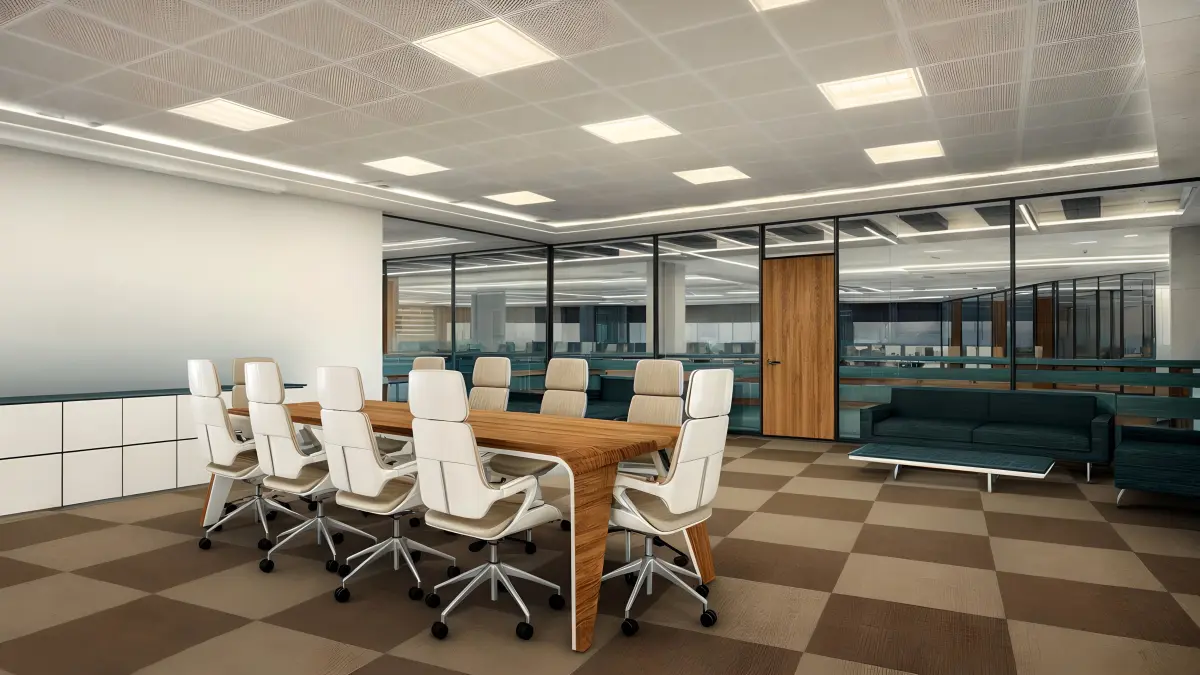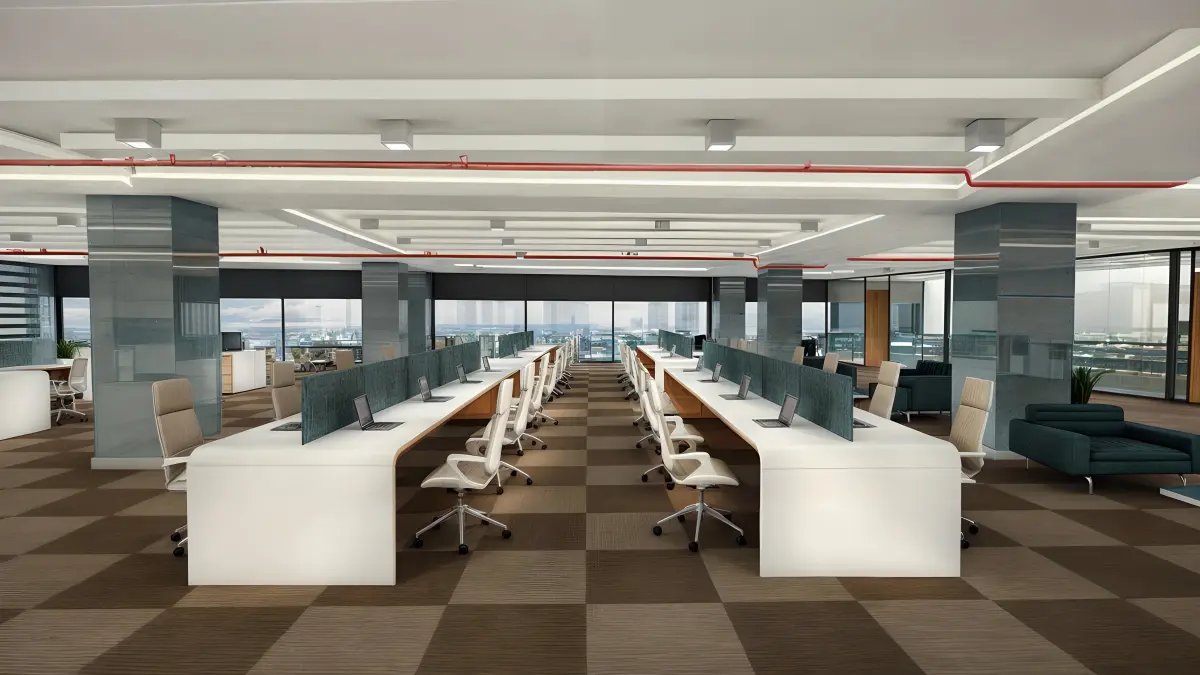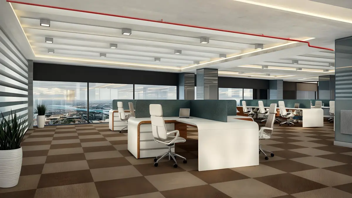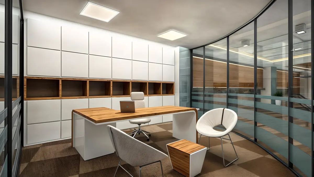 This modern office design emphasizes openness and collaboration. The space features a neutral color palette of whites, grays, and blacks, with vibrant accents for a dynamic feel. The use of glass partitions provides private meeting areas while maintaining an open atmosphere. Ergonomic furniture, including adjustable chairs and spacious desks, promotes comfort and productivity. The office is well-lit with large windows that allow natural light to flood the space, complemented by modern lighting fixtures. Wood accents in the flooring and furniture add warmth and texture, creating a balanced and inviting workspace.