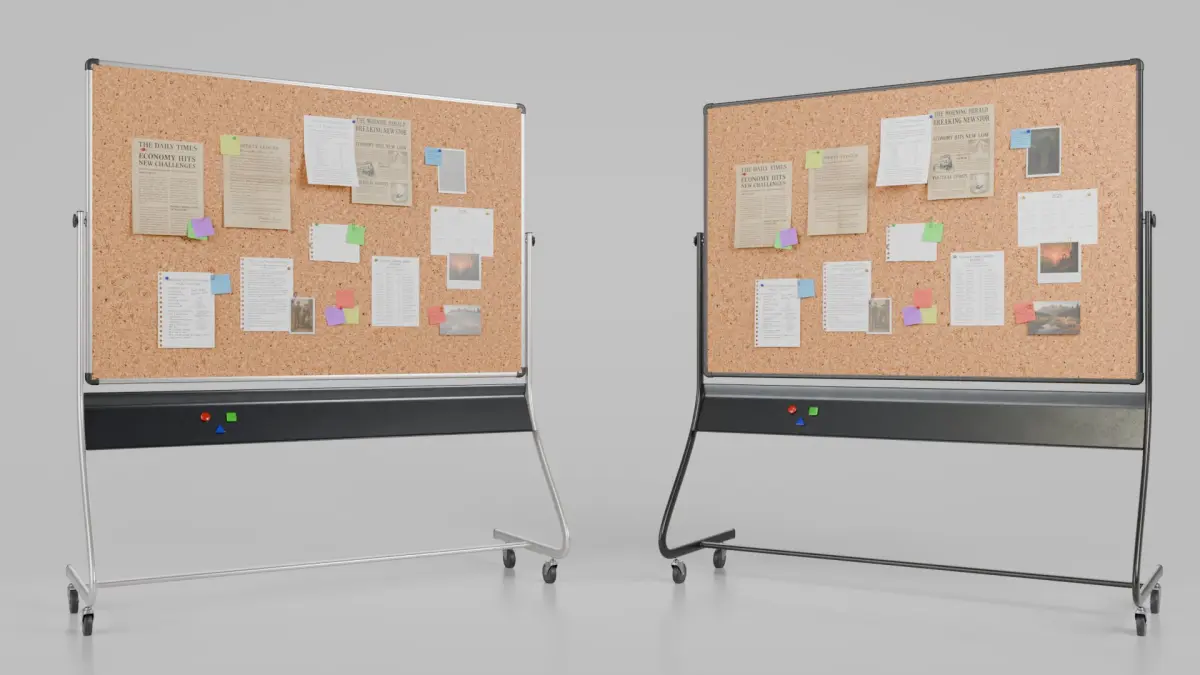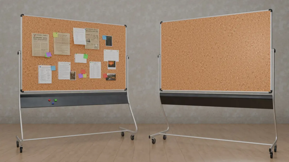 A high-quality 3D asset featuring a set of four fully customizable corkboards (3 wall-mounted and one with a metal stand) with wooden and metal frames in rectangular and square forms, complete with pre-assembled office accessories. Ideal for office scenes, classroom environments, architectural visualization, and game design.