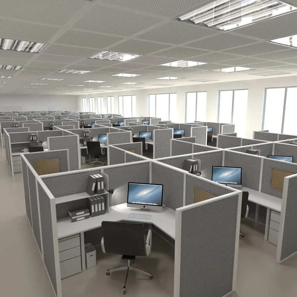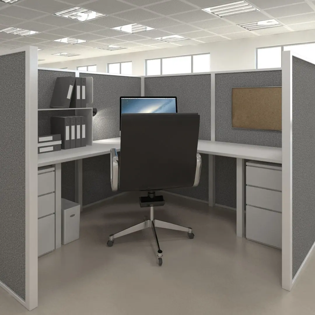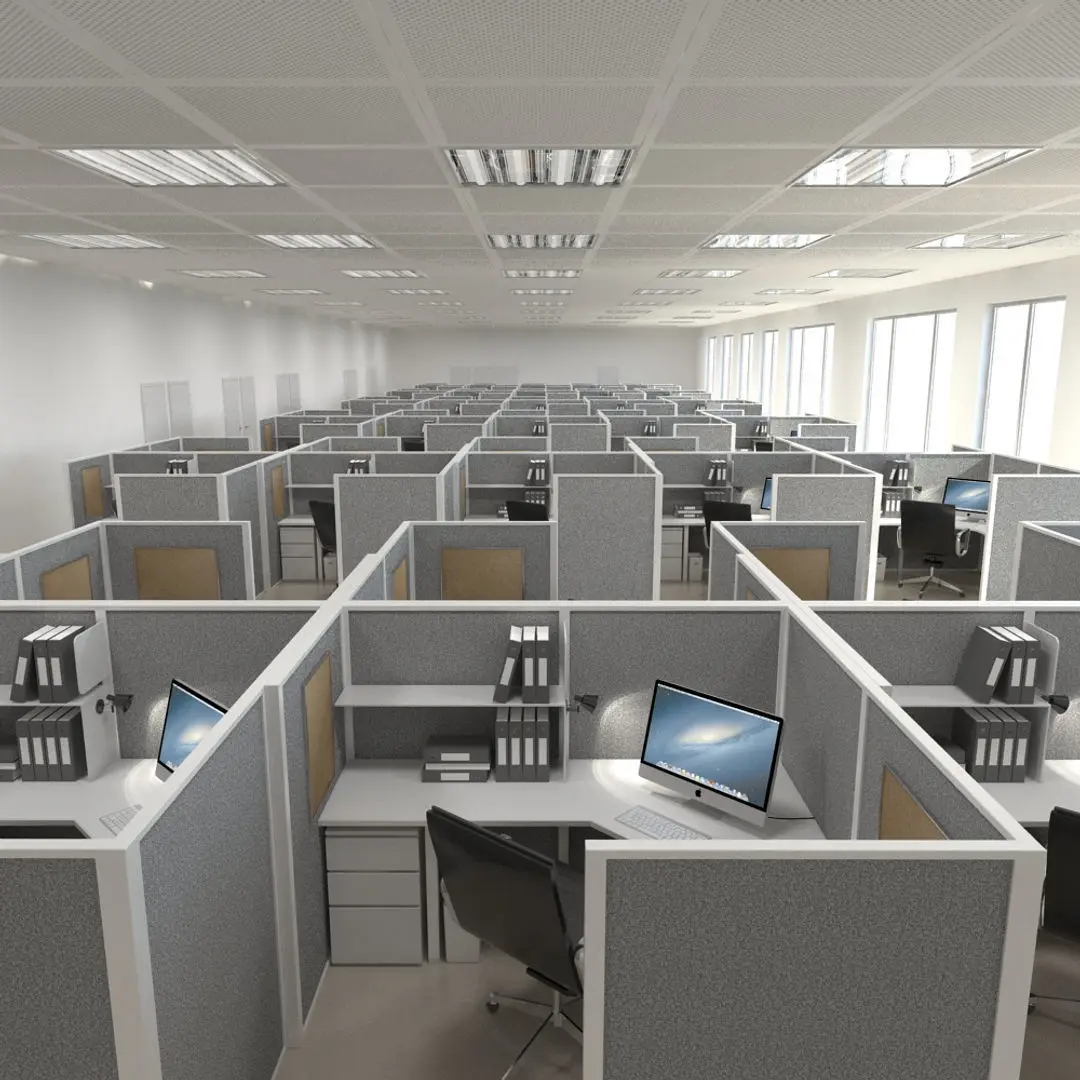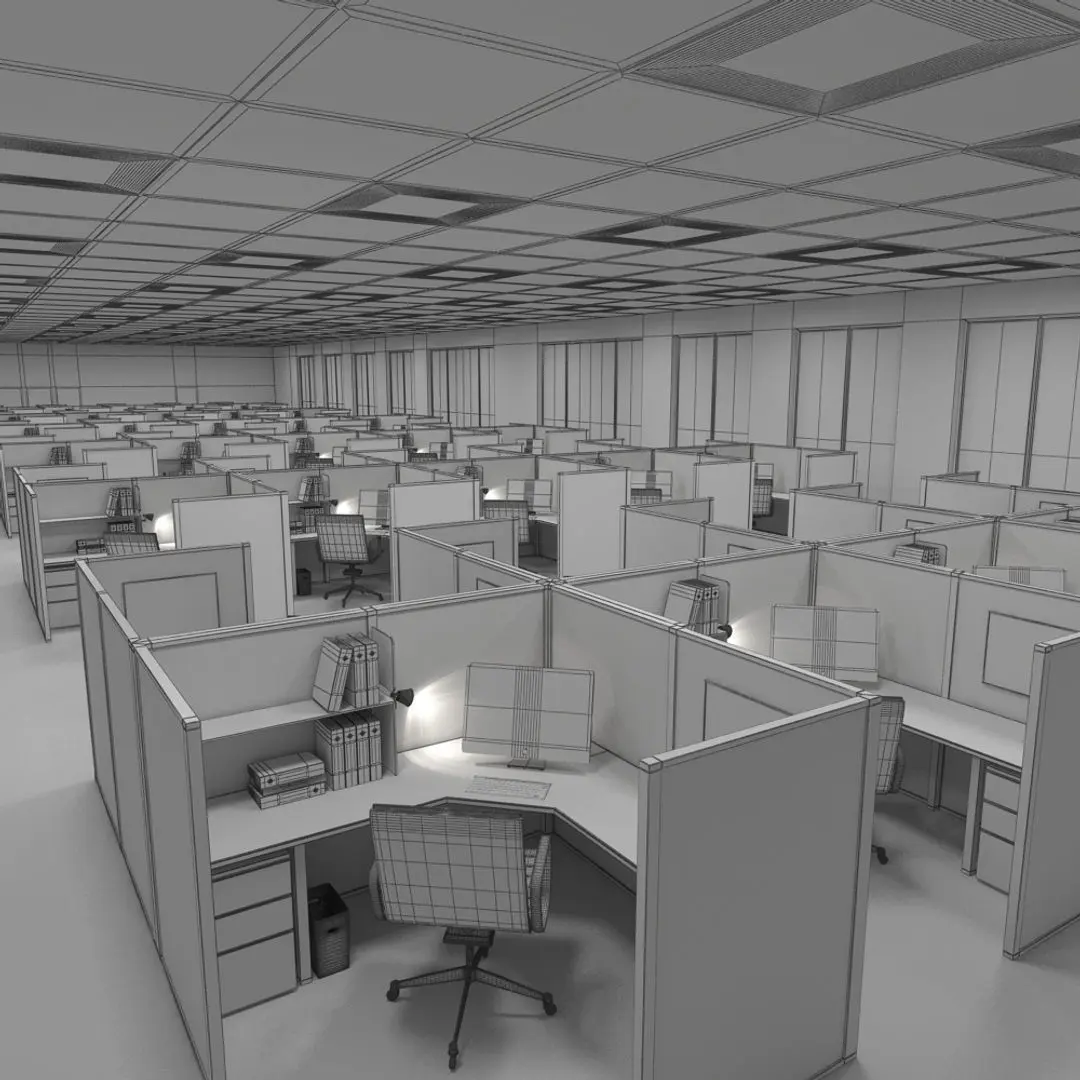 A highly detailed 3D model scene of an office interior.