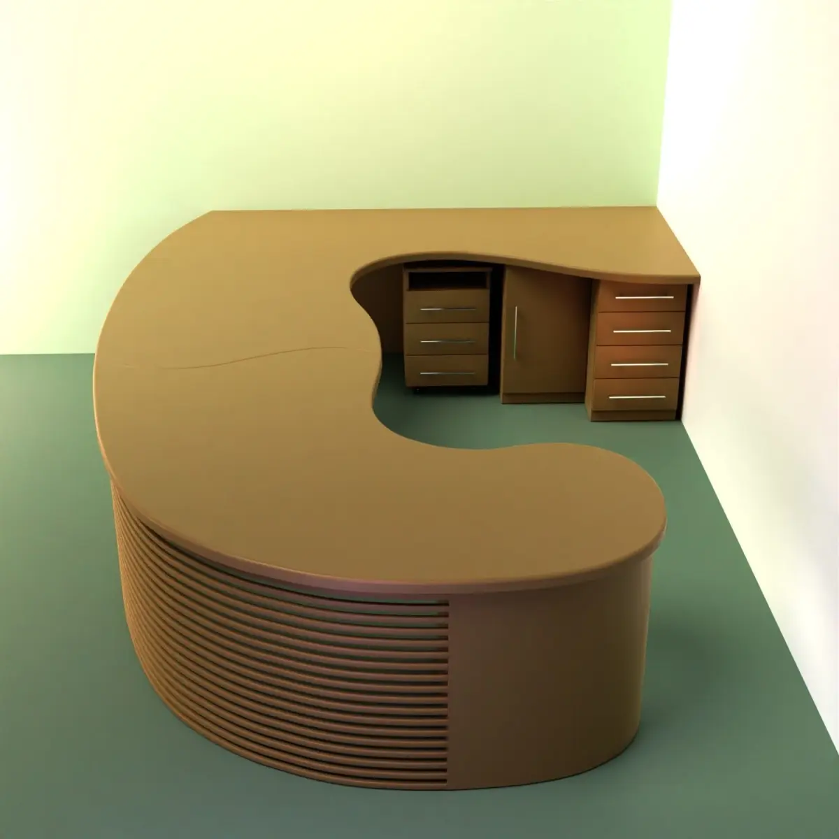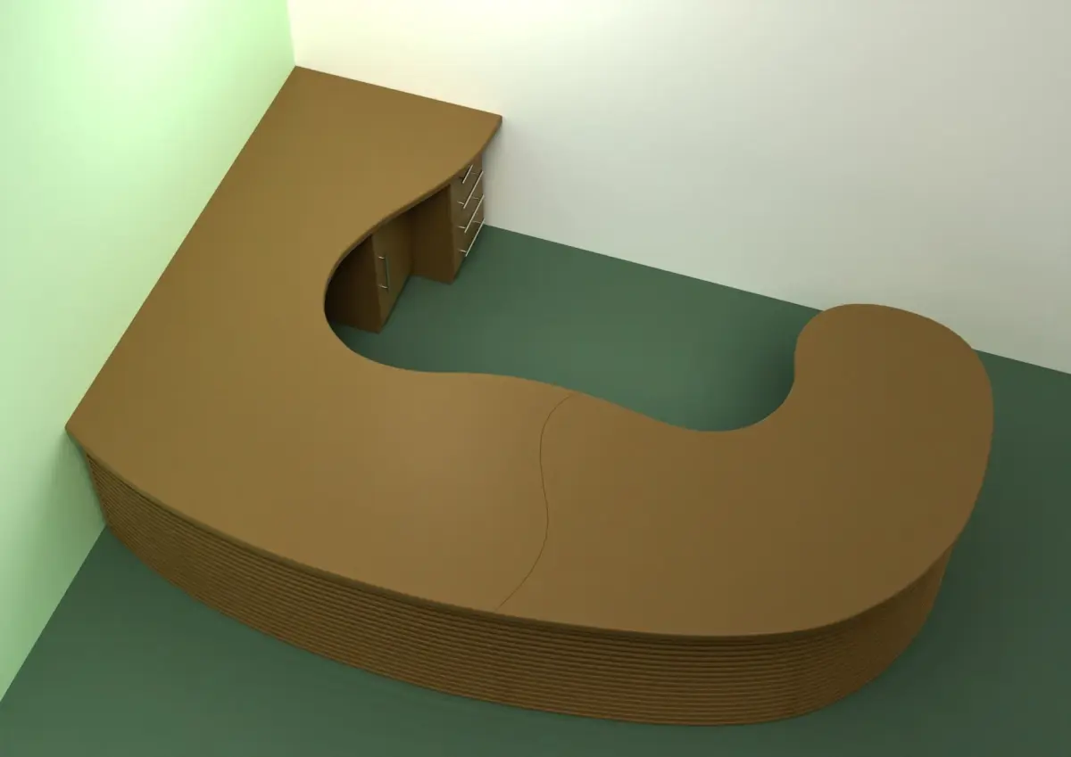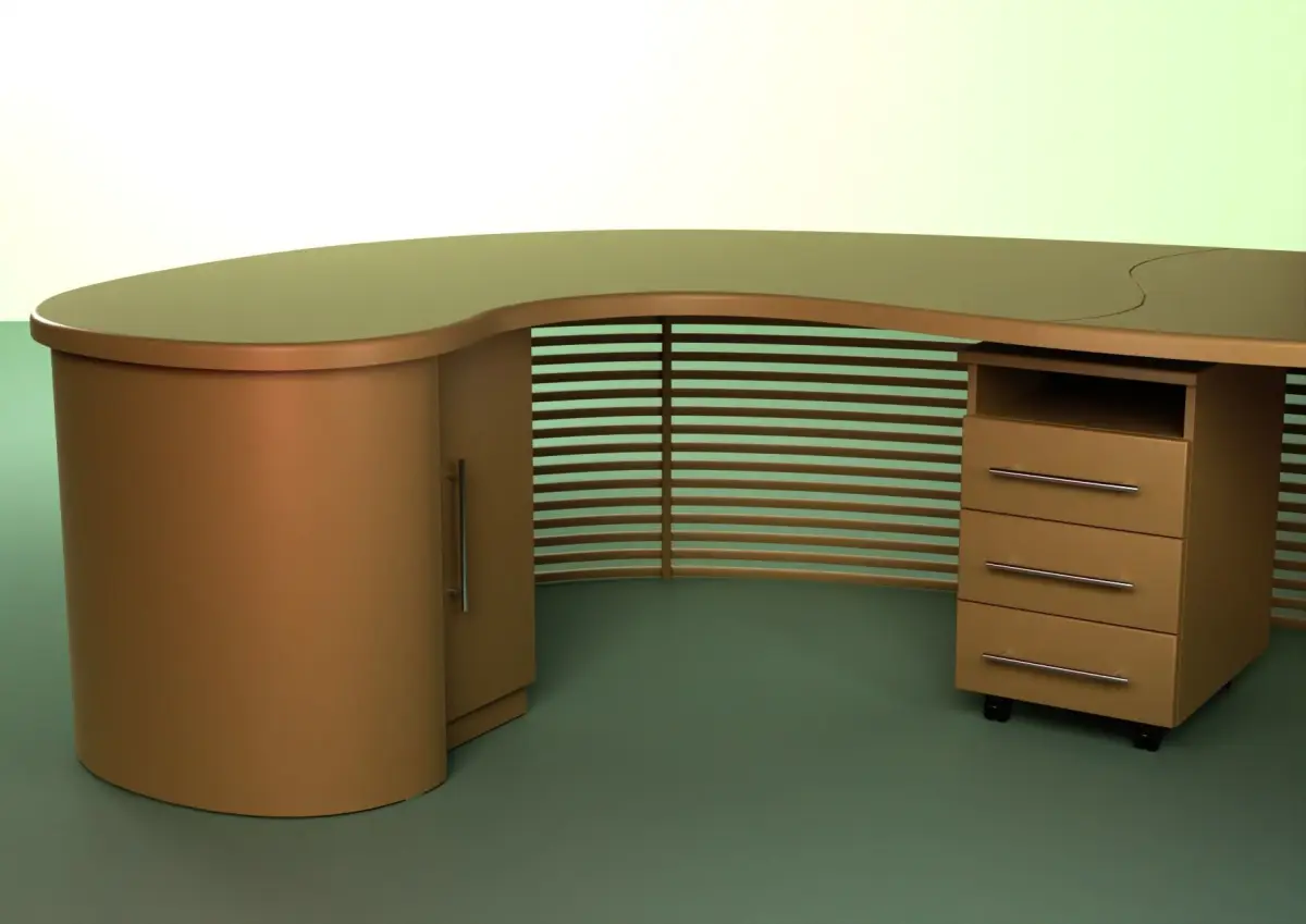 Office table. Administrator's desk.Large corner table for 2 people.The table set includes 4 bedside tables, one of which is mobile.The tabletop consists of two parts, the seam between them can be seen.Dimensions: 3500*2550*765 mm. The work was done in blender 3.2.2.The model is available in blend, dae, obj, x3d, stl, abc, glb, usdc, fbx formats.