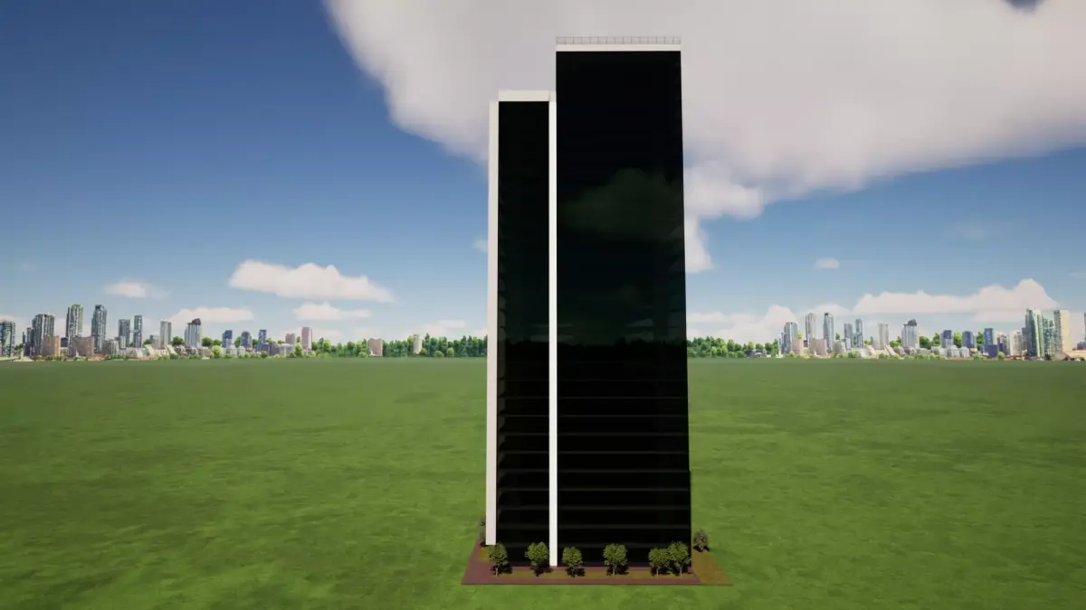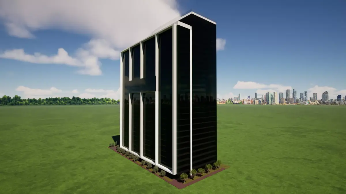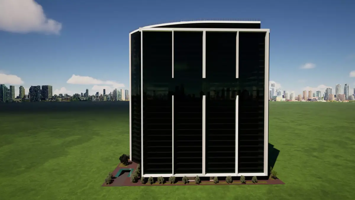 The building reaches 100 meters in height and includes 30 floors, designed with a strong vertical expression and a modern glazed façade suitable for corporate use. The model represents an early exploration of high-rise office typologies and urban scale.