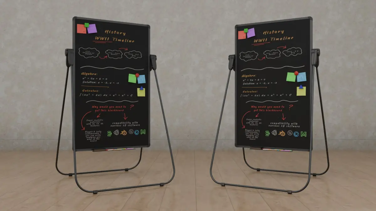A high-quality 3D asset pack featuring professionally designed writing boards (blackboard, greenboard, and whiteboard), available in both wall-mounted and freestanding configurations. These models are ideal for architectural visualization, virtual training, game environments, and educational simulations. Each model is meticulously optimized with clean topology and realistic textures for seamless integration into digital projects.