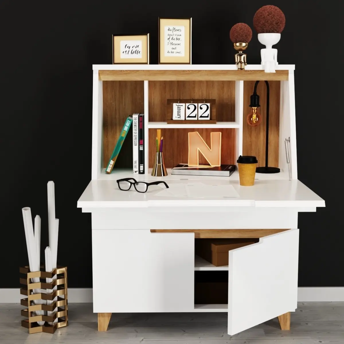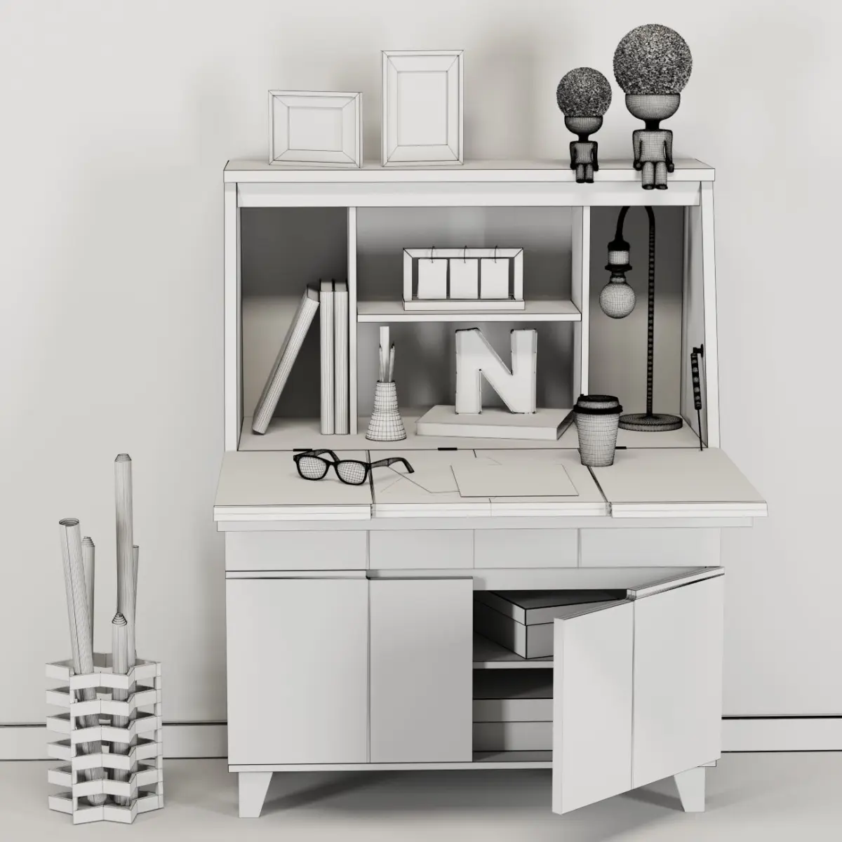 This is the Multi work Desk that has 2 drawer one of them for make stable the desk and another one is bigger and has space for use bottom the drawer is a double door with a shelf ..these doors doesn't have handle but they have a design for easy opening with hand.the objects include are: boxes,map basket,glasses,pencilcase,calender,table light,paper cup,books,picture frame,2 anatomy potThe main door that can be open and use as a desk or can close and be as a cabinet.All the object has material and ready fo renderyou can use each object you want for your scence(Please turn on the Turbosmooth Modifier for chair)All the Units: CentimeterThe Max height: About 127CmThe Max Widght: About 95Cmobj and fbx file is includeI hope you like i t