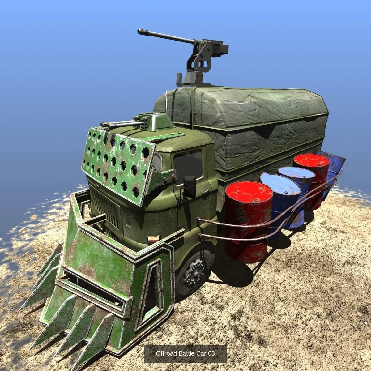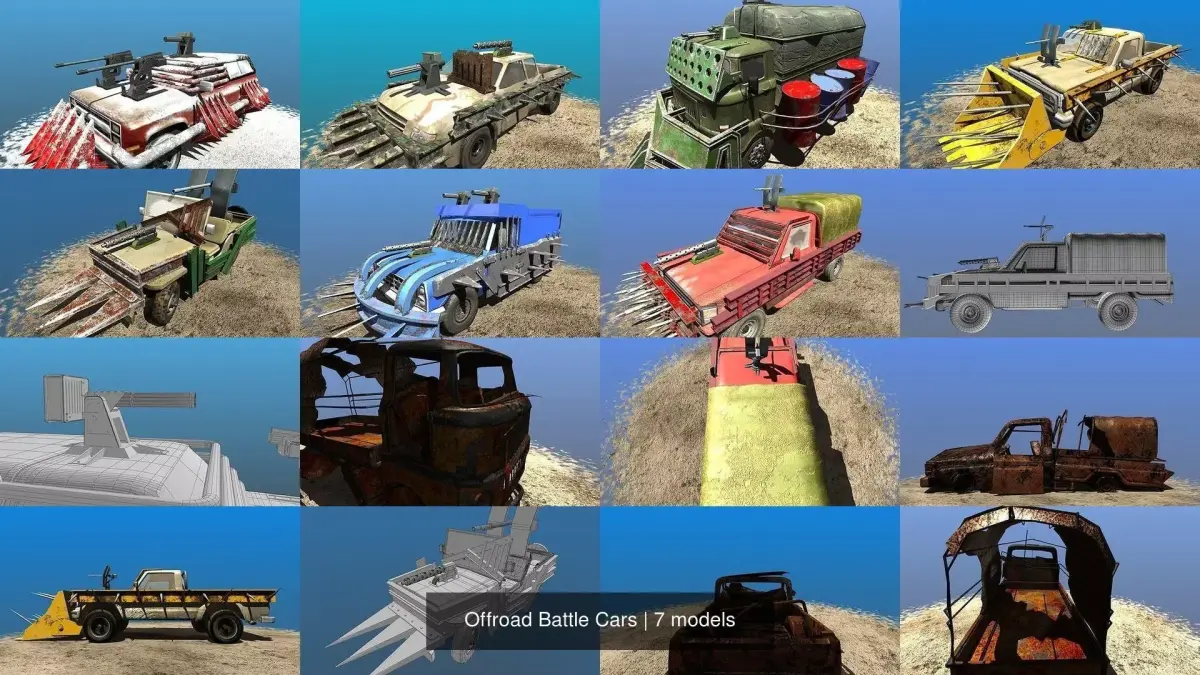 This is a mid poly off-road cars collection with 7 different cars. The cars have guns and accessories, Perfect for use in off-road, race, combat or even zombie games! Cars have 3 guards and guns. Models are Fully materialised and textured, fully uvw-mapped. All textures(1024/2048) and materials are included. Textures include : colorsmoothnessmetalnessnormalspecularopasity. Modeled in 3d-studio Max 2016.