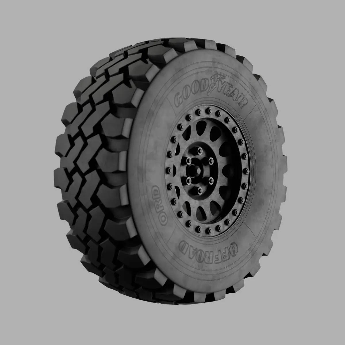 Offroad Heavy Tyers based on Goodyear Tyers with baked textures, sub-div ready geometry, and node setup for different conditions