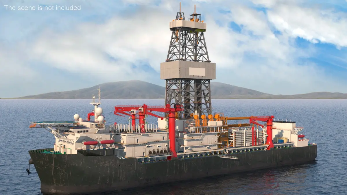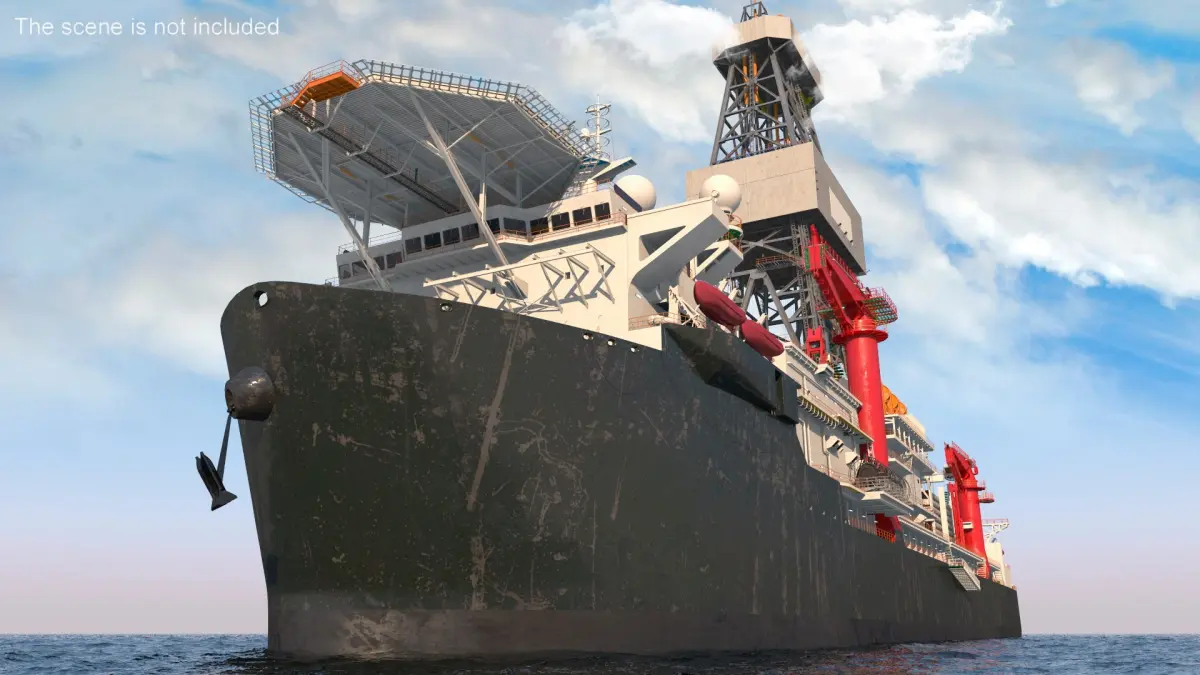 Offshore Drilling Ship is a three-dimensional model of specialized vessel used in offshore drilling operations, designed to extract petroleum and natural gas from beneath the ocean floor.