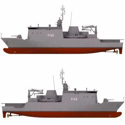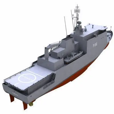 Offshore Patrol Vessel with two fast interception craft onboard. Used for general patrol duties & fishery protection in territorial waters.Lenght: 90mBeam: 16mCarries 2 X Fast Interception Craft & has heli pad on stern.