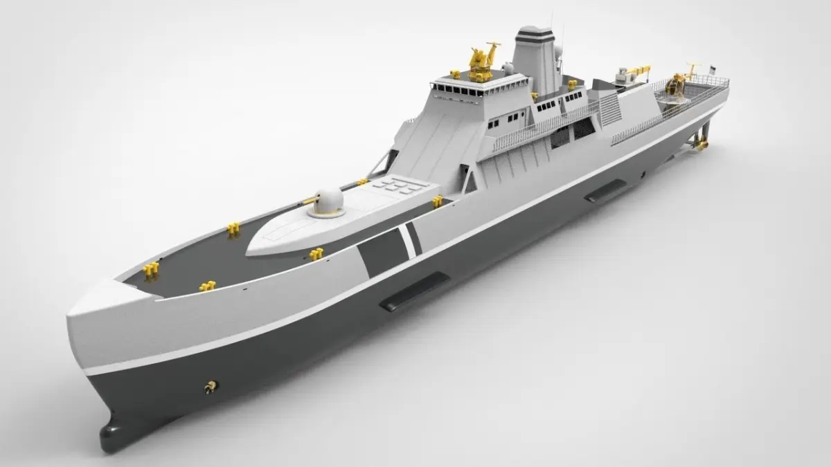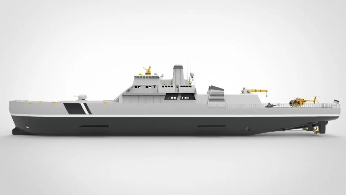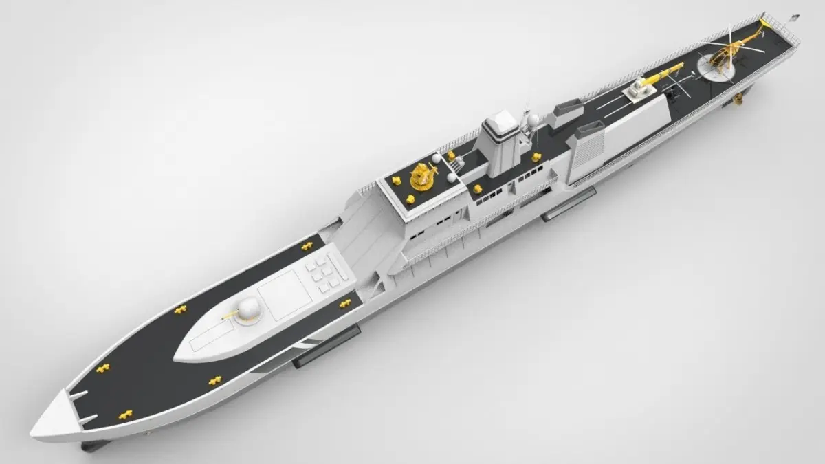 This is a model of the type of warship or coast guard ship, this ship has a dimension of 90 meters with a speed of up to 22 knots, is designed with a destroyer cannon on the front deck in the bow of the ship, and is equipped with a helicopter landing on the back of the ship or a stern deck.