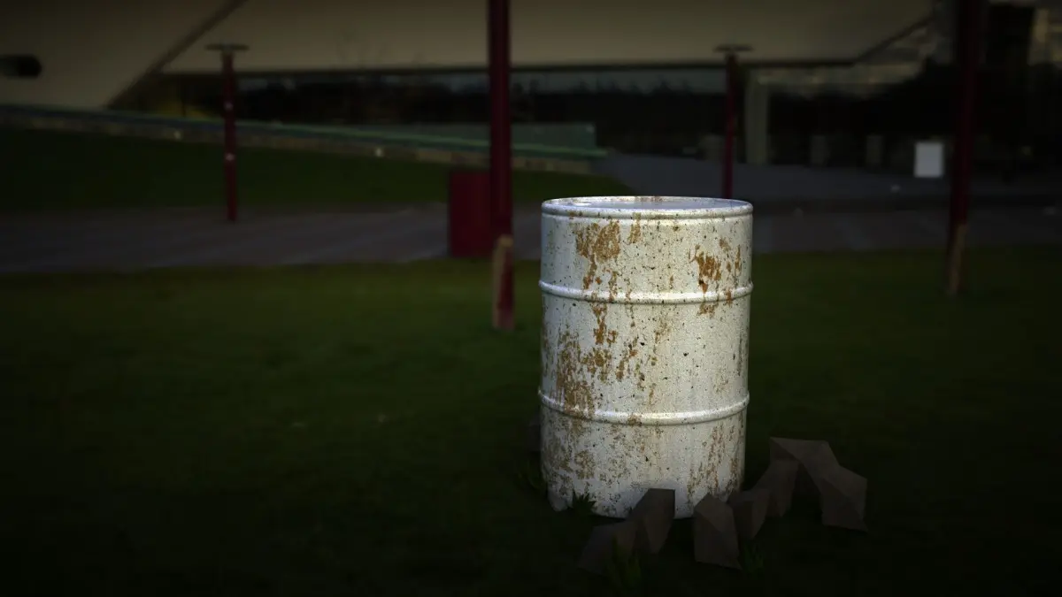 Realistic 3d model of a Oil Barrel in a greeny environment, surrounded by some 3d rocks and 3d grass.