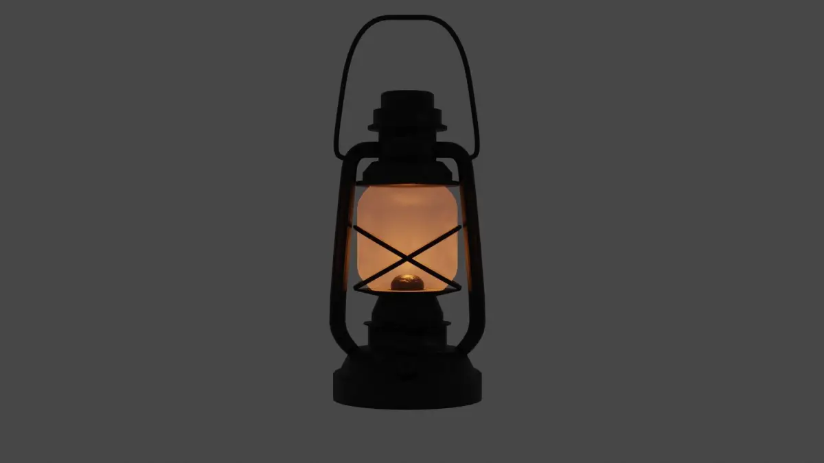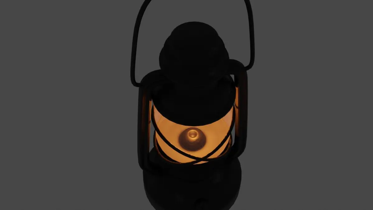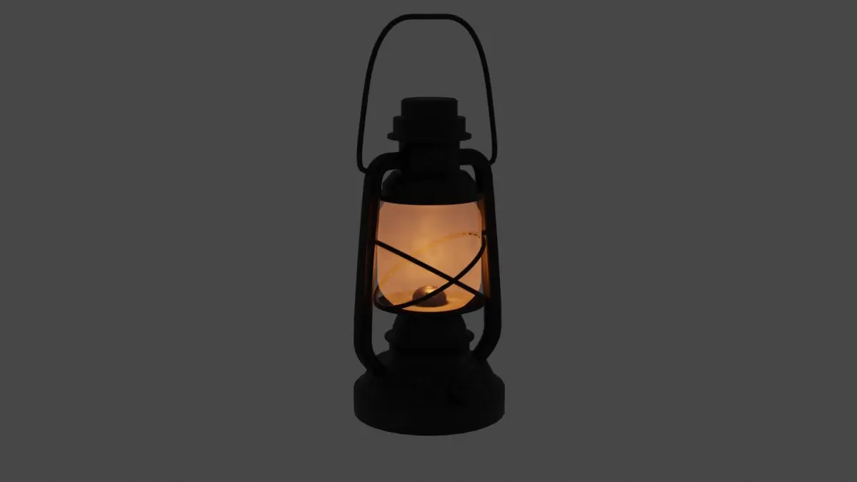 A low poly handheld oil lamp textured with scrapped black metal and smudged glass.