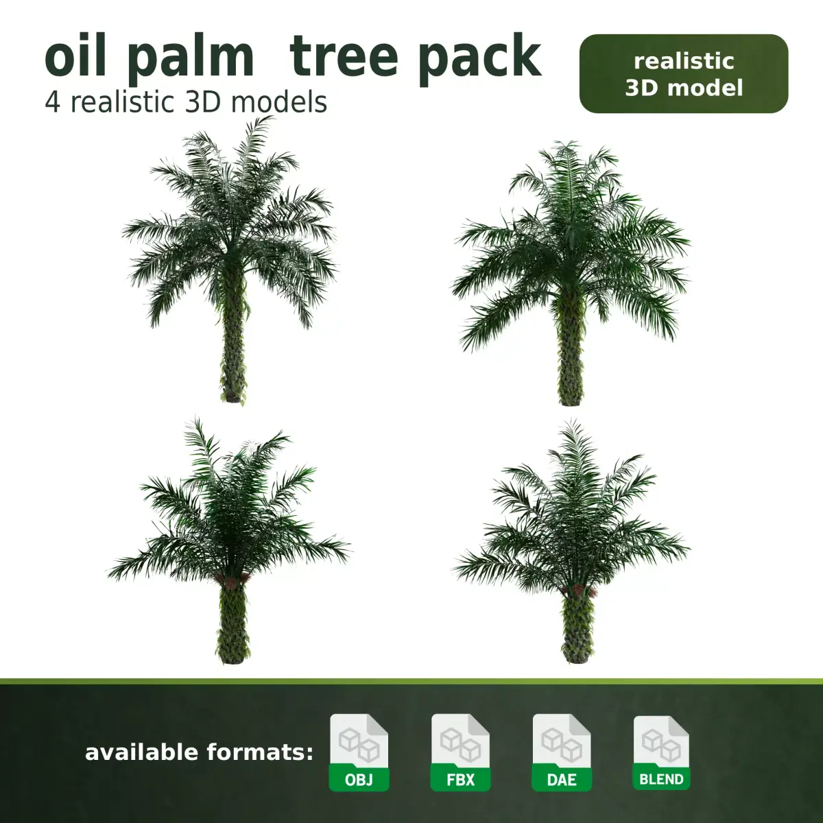 High quality Oil Palm Tree pack featuring 4 variations of Elaeis guineensis.Created for tropical landscapes, architectural visualization, plantation scenes, and large-scale environment projects.Each model is built with balanced proportions and natural leaf variation to reduce repetition in wide scenes.