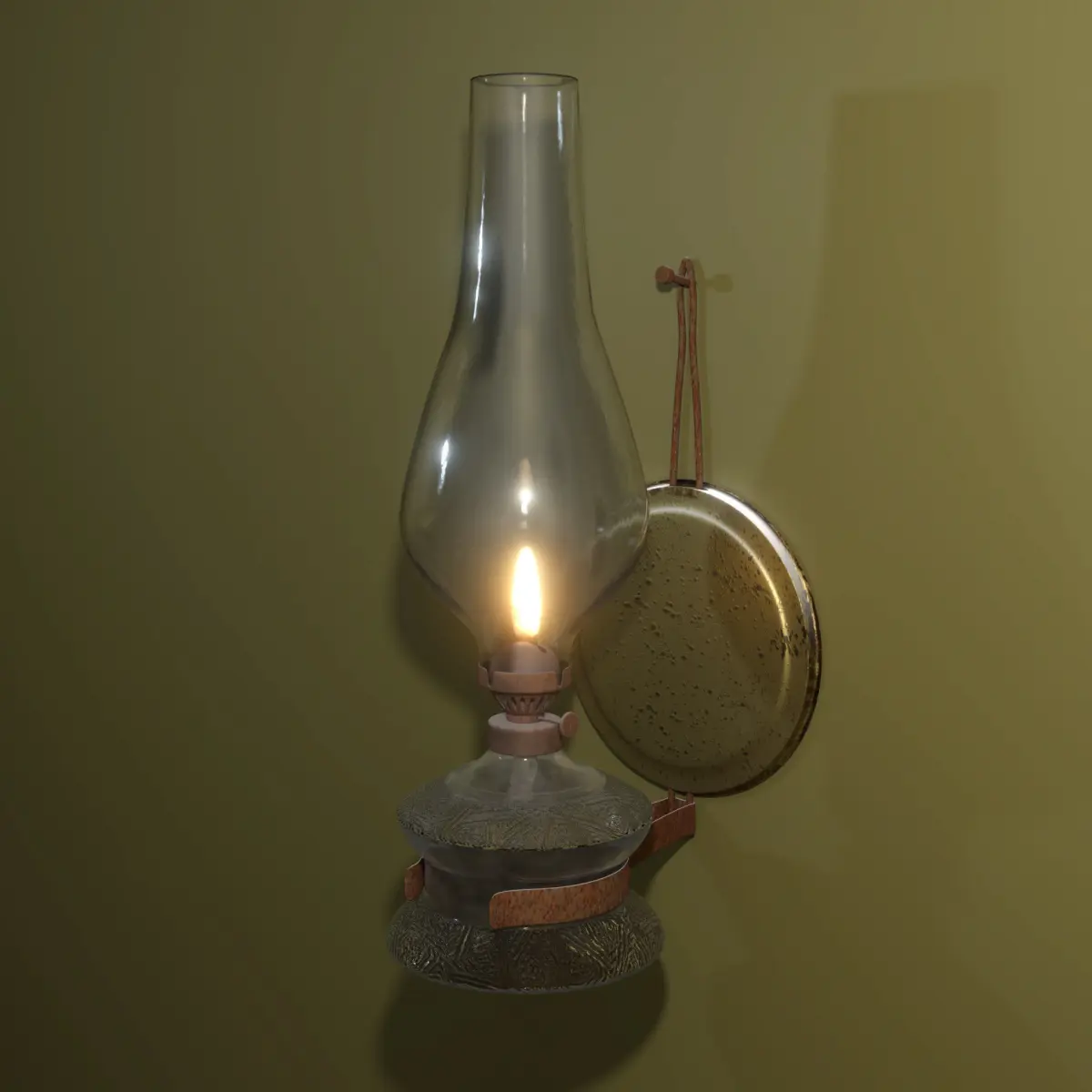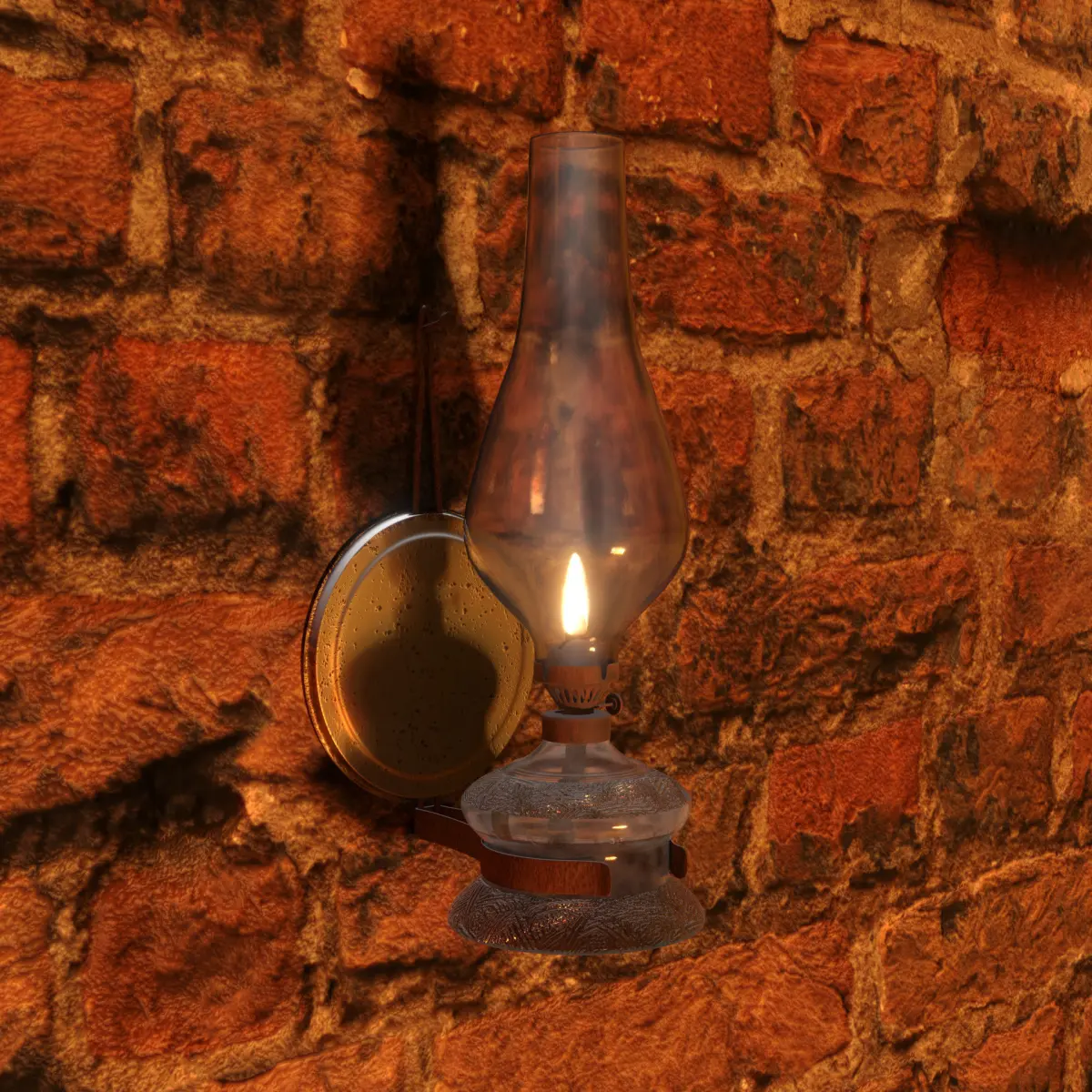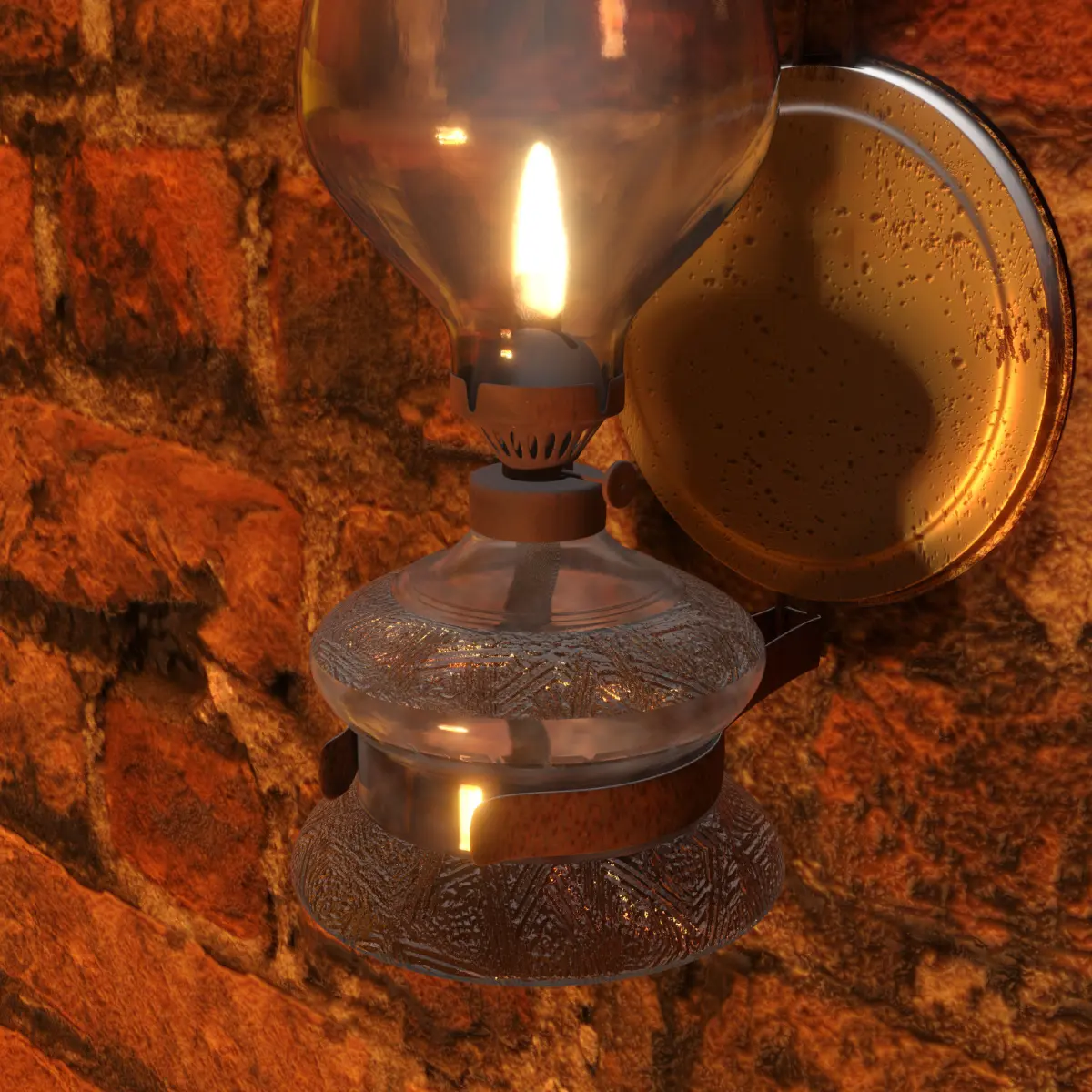 Some textures are PBR (wall, rust on the holder and the nail & glass decoration) and some others are procedurals (glass). The metal narrow part that holds the wick is texture painted. The circle metal part that touches the wall is also texture painted.