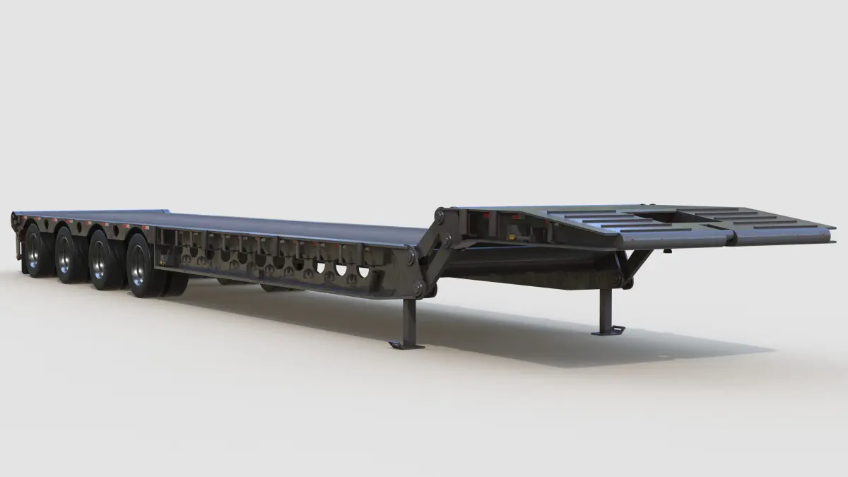 The Scissor Neck Oilfield Trailer - A heavy-duty, low-profile trailer designed specifically for transporting oilfield equipment and machinery. They features a unique scissor neck mechanism that allows the neck to lower to the ground for easy loading and unloading of large, self-propelled equipment or for winching equipment from the rear - Built for rugged conditions, these trailers offer high load capacity, reinforced decks, and multiple axle configurations to handle the demanding terrain and weight requirements of oilfield operations.