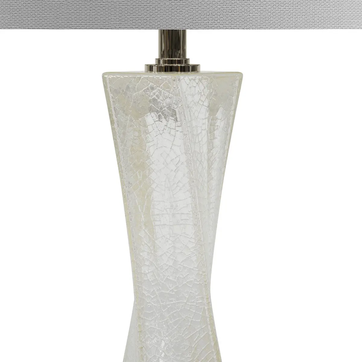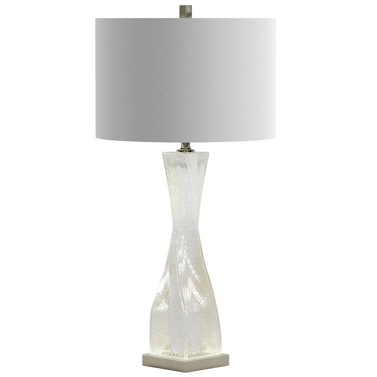 Enjoy the elegant silhouette of this twist mercury glass table lamp. It's fashioned with an elegant crackle silver finish over mercury glass construction atop a clear acrylic base and topped with a cool white faux silk fabric drum shade. This lamp will add a touch of refinement to your living room, bedroom, or home office environment.