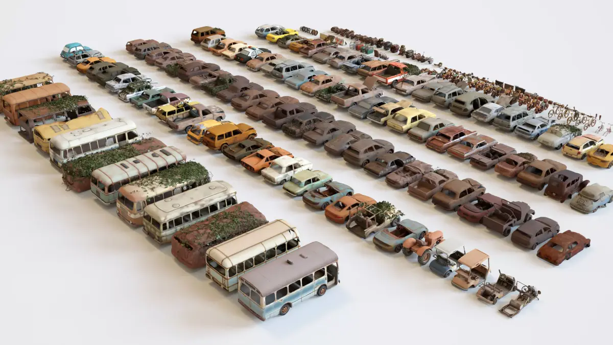 abandoned cars, rusty vehicles, post apocalyptic cars, destroyed vehicles, junkyard cars, old cars pack, urban decay, survival environment, zombie apocalypse, dystopian world, derelict vehicles, broken cars, scrap yard, cinematic environment, game ready props, pbr vehicles, realistic rust, abandoned city assets, damaged cars, environment props pack, old buses, pickup trucks, suv wreck, vintage cars, overgrown vehicles