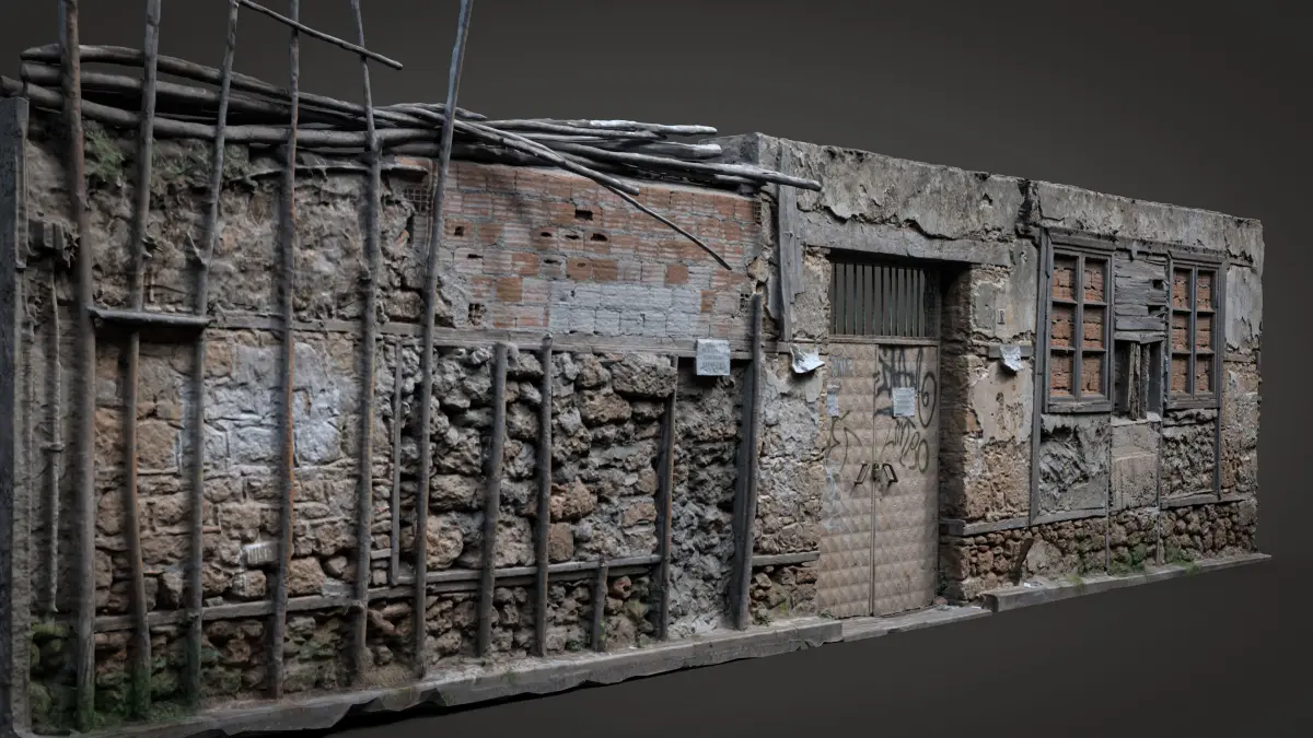 This is a high-quality game-ready 3D asset of an old, abandoned wall featuring cracked plaster, stone, decayed wood, and metal bars. Perfect for urban scenes, post-apocalyptic settings, and realistic game environments.