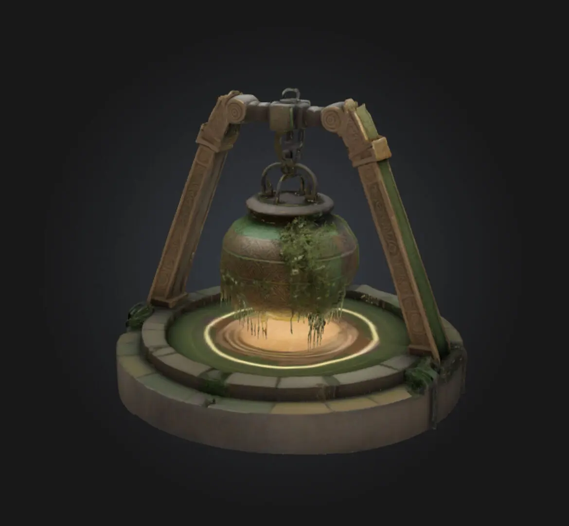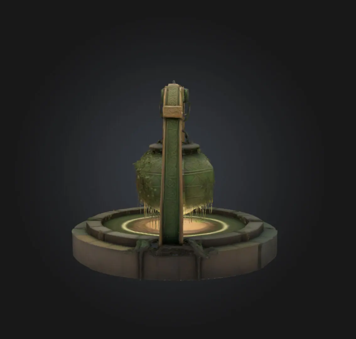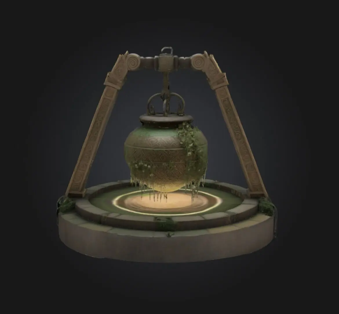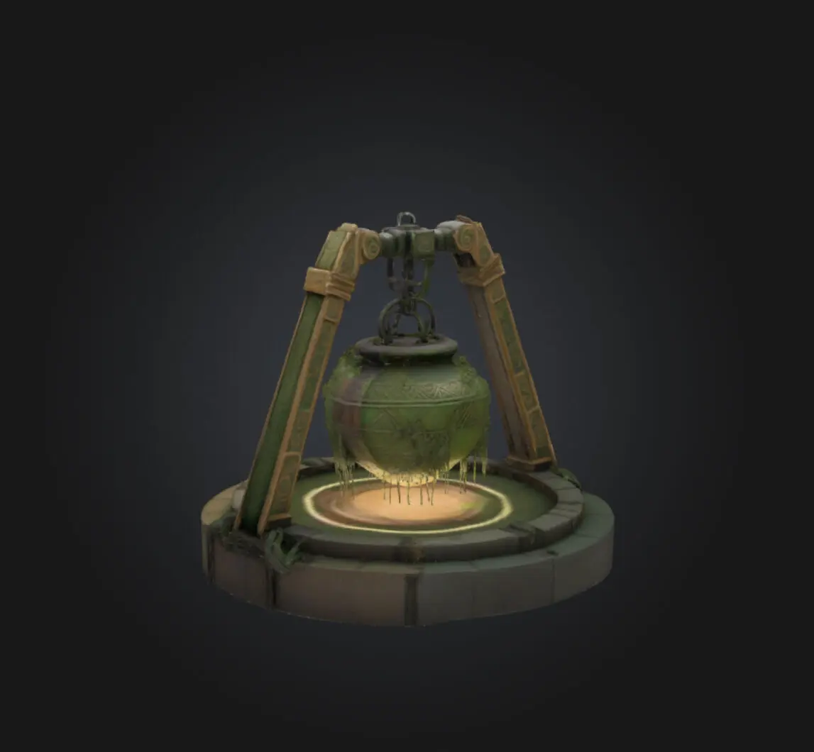 The model features a cauldron-like container suspended by a mechanical arm structure.The entire assembly has a distinct industrial and mystical aesthetic.Materials & Textures: