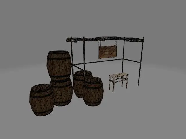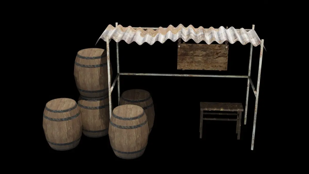 Some place look like a waiting or resting place. Combined with a steel frame, wood notice board, wood chair, and some barrels. It maybe located in the tranditional village.
