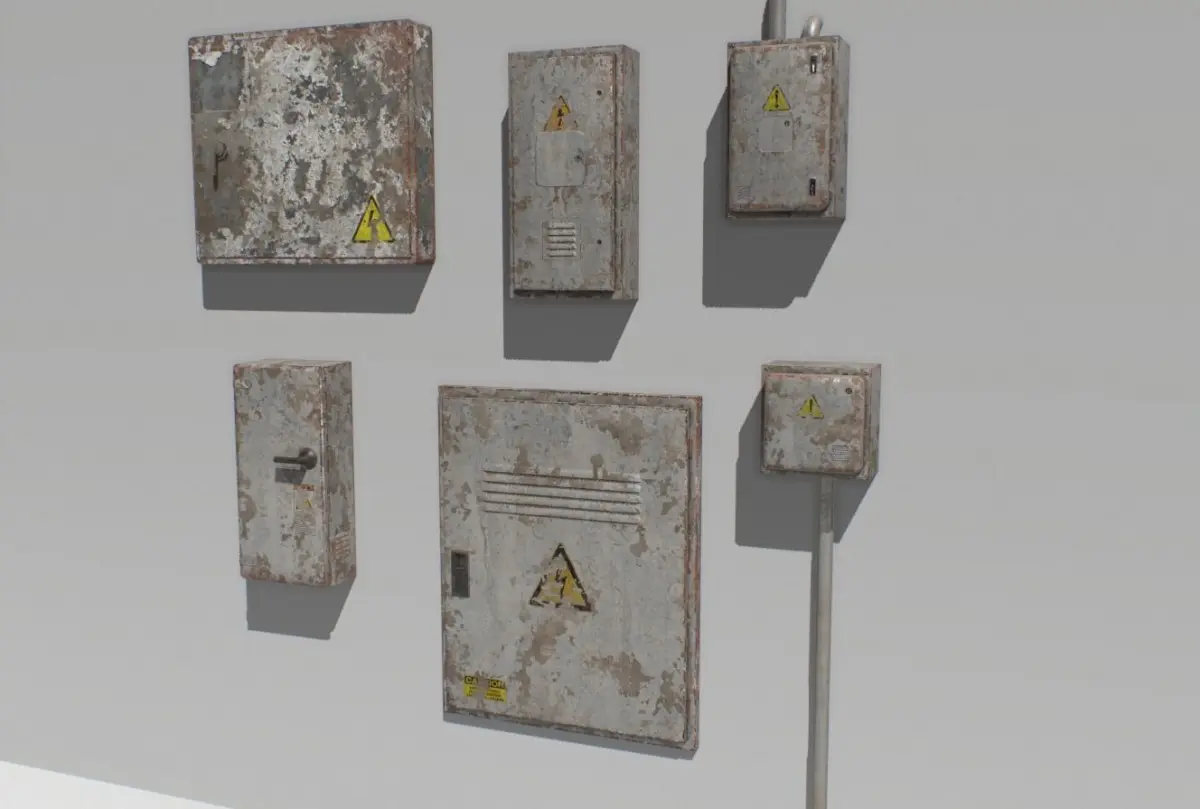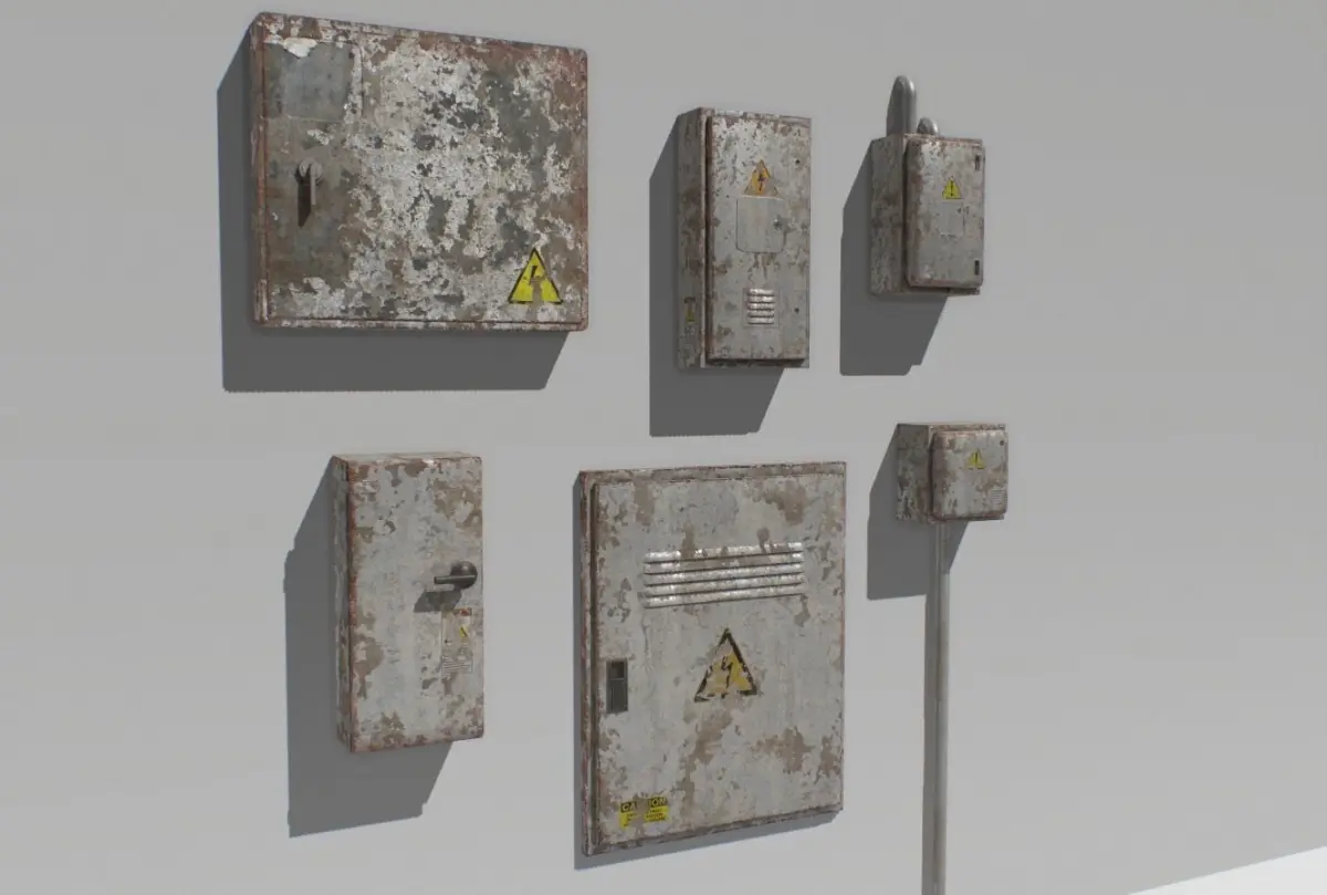 Pack of 6 old electrical boxes based in real ones. Real scale.
