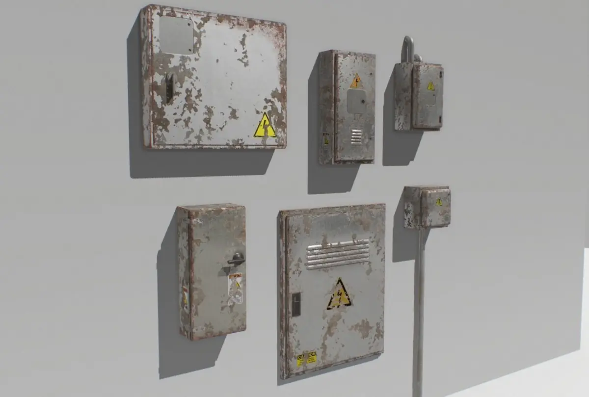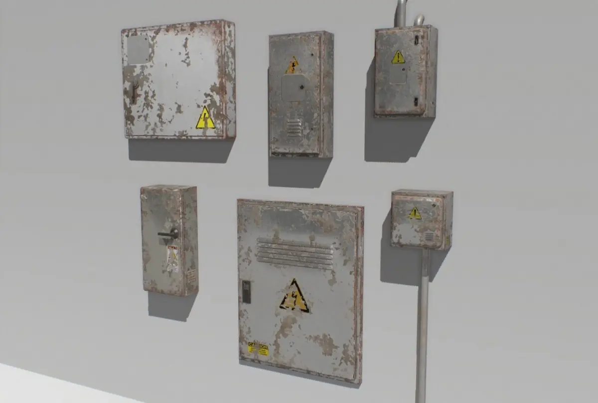 Pack of 6 old electrical boxes based in real ones. Real scale.