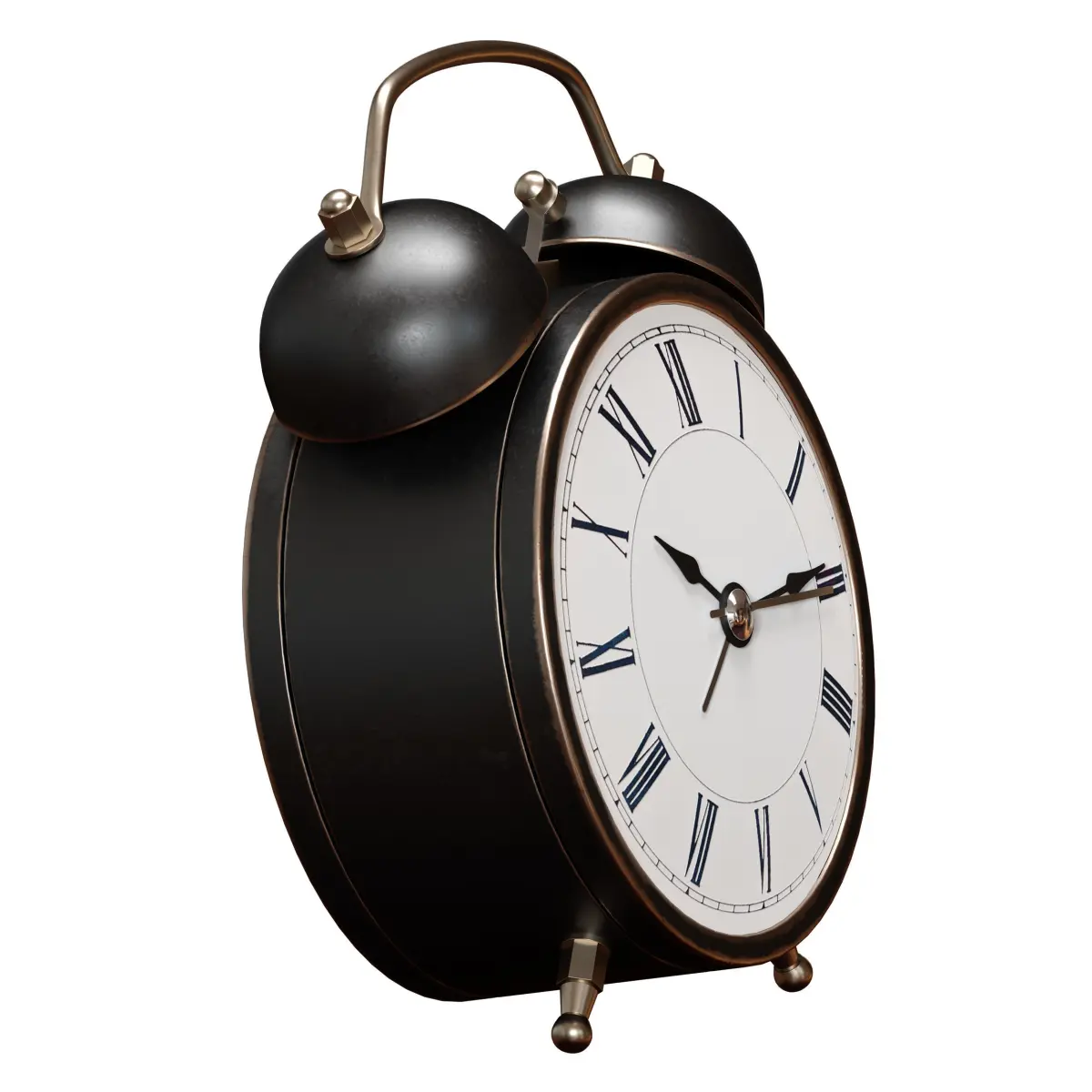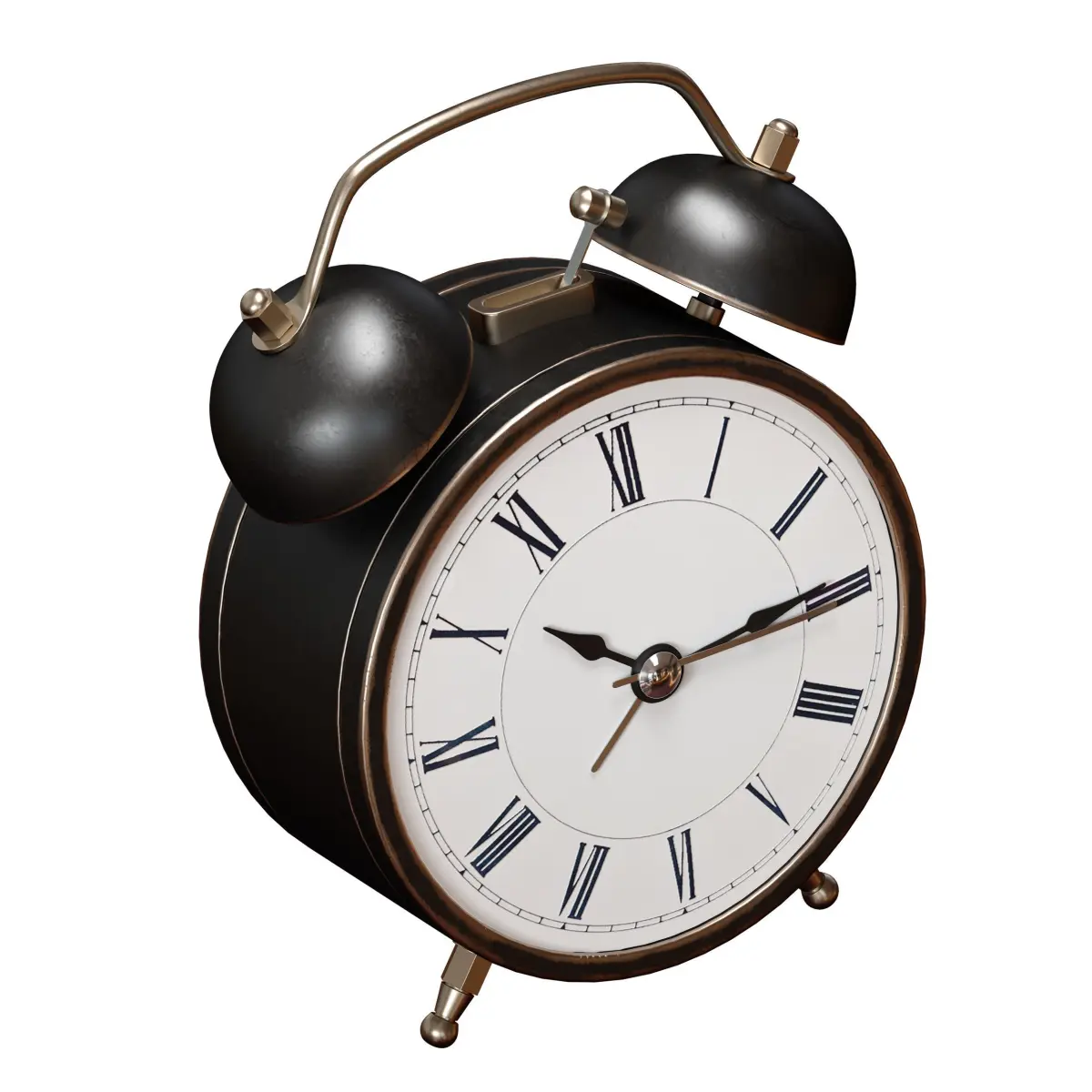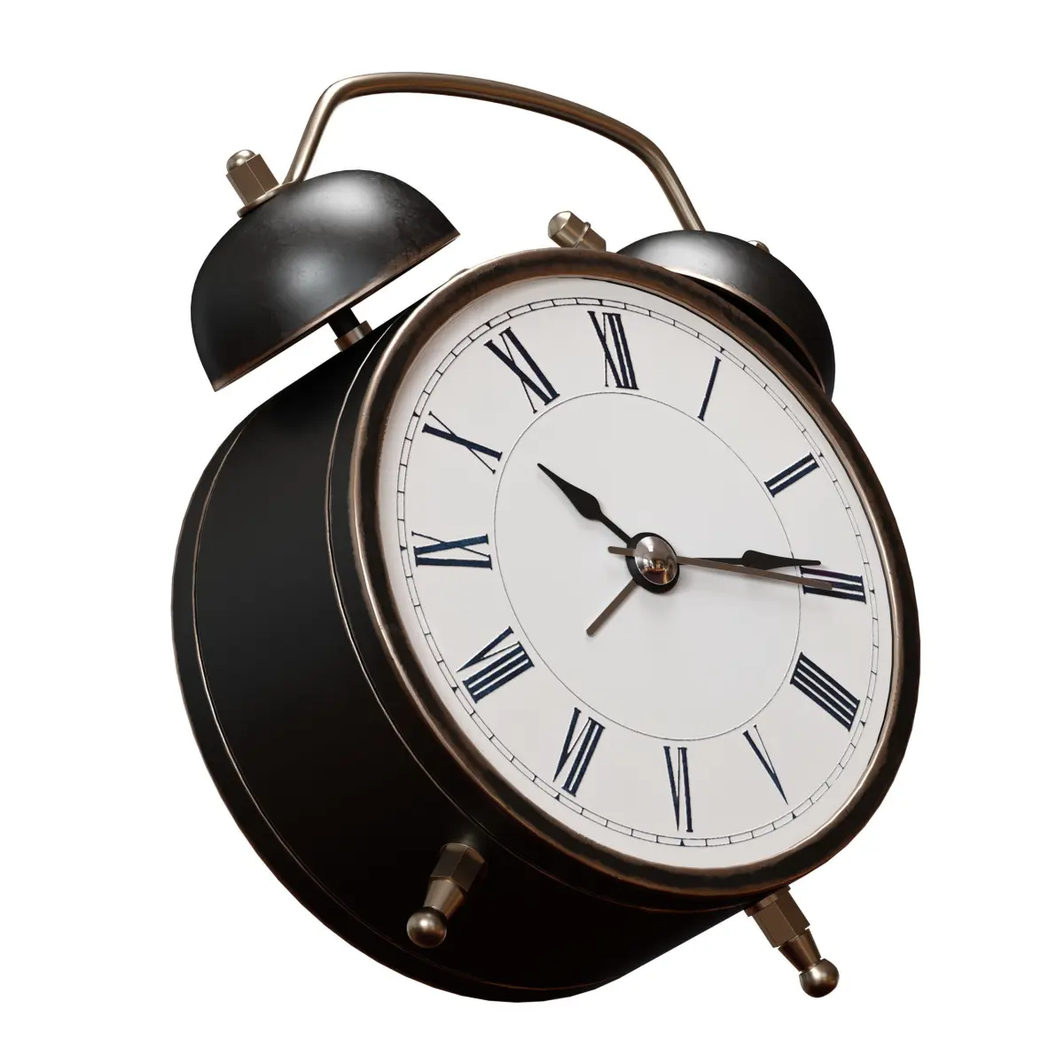3D model of a vintage antique alarm clock. Made of metal with abrasions and glass. Black color.