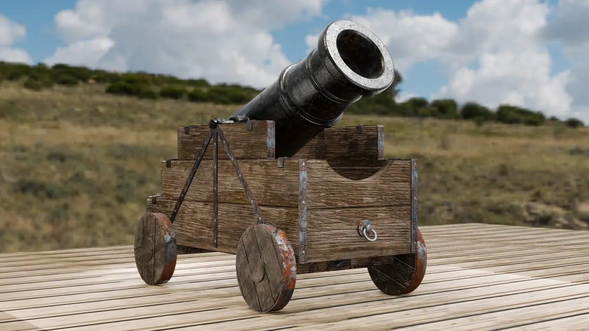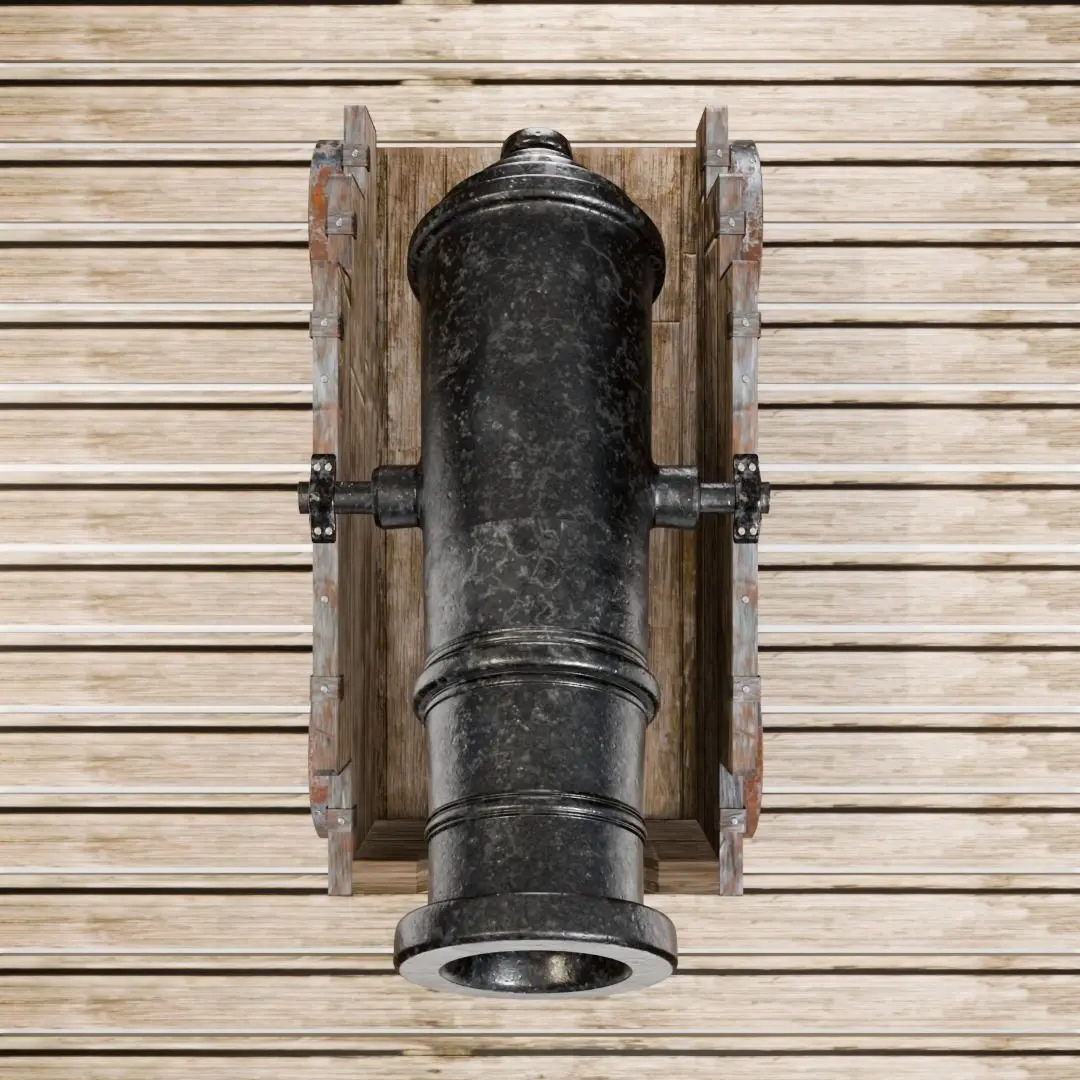 The cannon rests on robust wooden wheels, each encased in a weathered iron band, showcasing realistic signs of rust and age. The iron straps and nails further emphasize the rugged, battle-worn nature of the cannon.The centerpiece is the imposing black metal barrel, designed to capture the intimidating presence of a battlefield weapon. This model is ideal for historical reenactments, period films, or as a striking addition to a 3D artist's portfolio.Experience a piece of history with this Old Artillery Cannon, where every detail is a testament to the engineering marvels of the past.